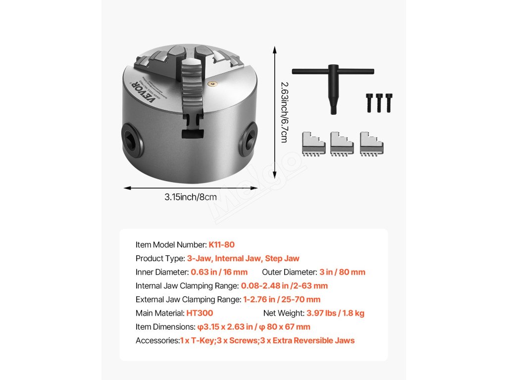 Vyrobené z prvotriednej liatiny HT300, tvrdosť čeľustí ≥53 HRC pre dlhotrvajúcu životnosť a odolnosť proti korózii. Samocentrovacie sústružnícke skľučovadlo poskytuje vysoko presné upnutie bez kalibrácie. Vďaka vnútornému priemeru 0,63 palca a vonkajšiemu priemeru 3 palce ľahko zvládne upínanie v rozsahu od 0,08 palca do 2,48 palca.