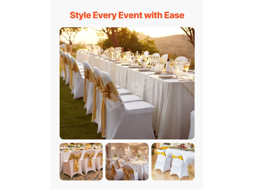 Táto elegantná súprava poťahov na banketové stoličky, vyrobená z vysokokvalitnej elastickej spandexovej tkaniny, zvýrazní jednotný vzhľad vašich stoličiek. Je ideálny na svadby, promócie, narodeniny a iné špeciálne príležitosti a dodá každej udalosti nádych sofistikovanosti a štýlu.