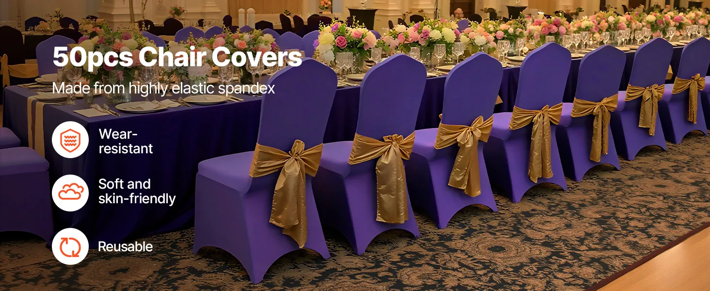 Táto elegantná súprava poťahov na banketové stoličky, vyrobená z vysokokvalitnej elastickej spandexovej tkaniny, zvýrazní jednotný vzhľad vašich stoličiek. Je ideálny na svadby, promócie, narodeniny a iné špeciálne príležitosti a dodá každej udalosti nádych sofistikovanosti a štýlu.