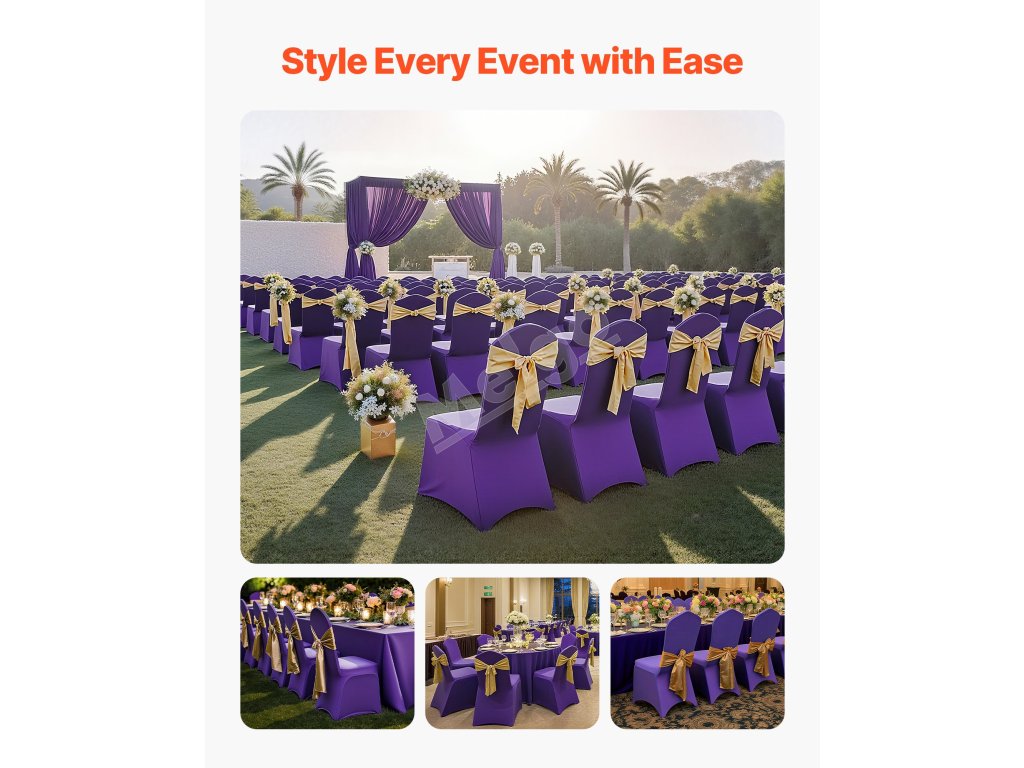 Táto elegantná súprava poťahov na banketové stoličky, vyrobená z vysokokvalitnej elastickej spandexovej tkaniny, zvýrazní jednotný vzhľad vašich stoličiek. Je ideálny na svadby, promócie, narodeniny a iné špeciálne príležitosti a dodá každej udalosti nádych sofistikovanosti a štýlu.