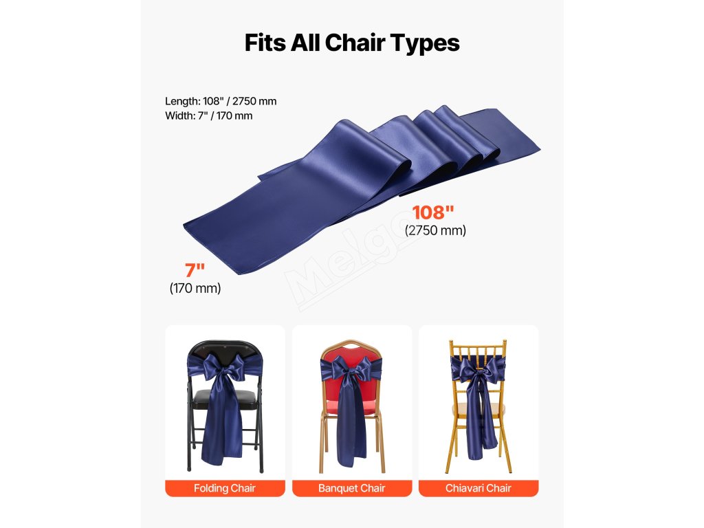 A2: Šerpy majú rozmery približne 275 cm x 17 cm (108" x 6,7") a sú navrhnuté tak, aby sa hodili na širokú škálu stoličiek - vrátane banketových stoličiek, skladacích stoličiek, stoličiek Chiavari a jedálenských stoličiek, pričom sú vhodné pre stoličky väčšiny veľkostí.