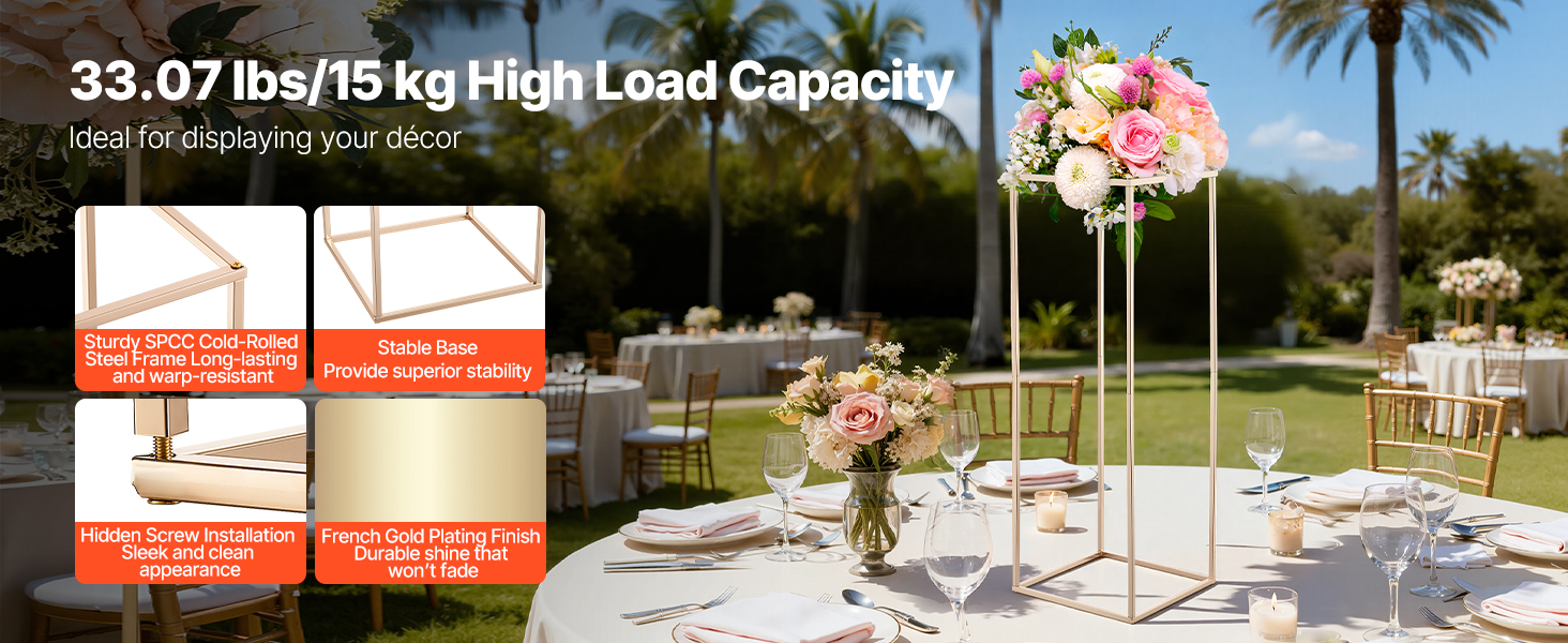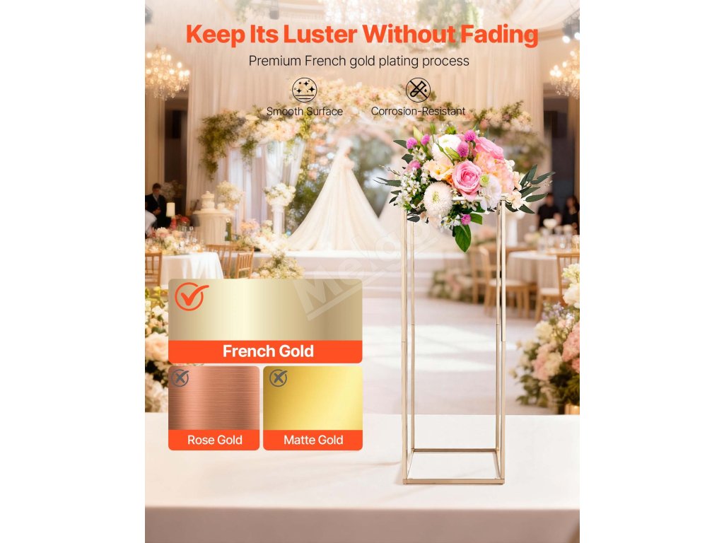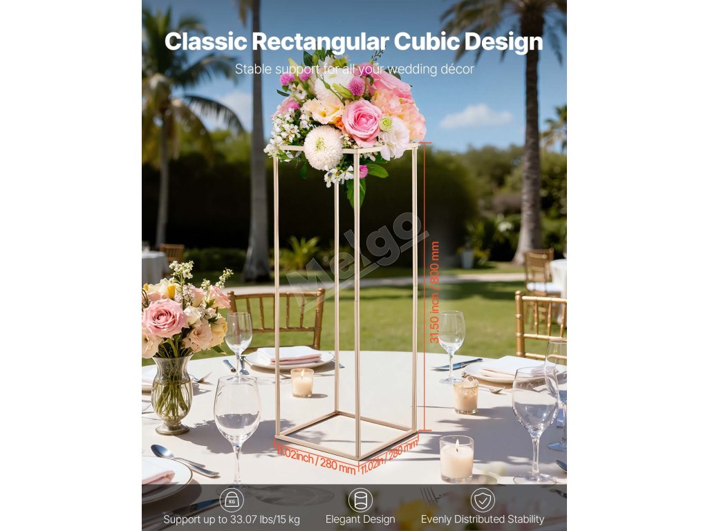 Náš 10-dielny stojan na svadobné kvety má klasický dizajn obdĺžnikovej kocky s konštrukciou SPCC valcovanou za studena a francúzskym pozlátením. Unesie až 33,07 lbs/15 kg, poskytuje stabilný stojan na kvety alebo dekorácie a zároveň vyniká hladkým, elegantným a odolným zlatým povrchom.