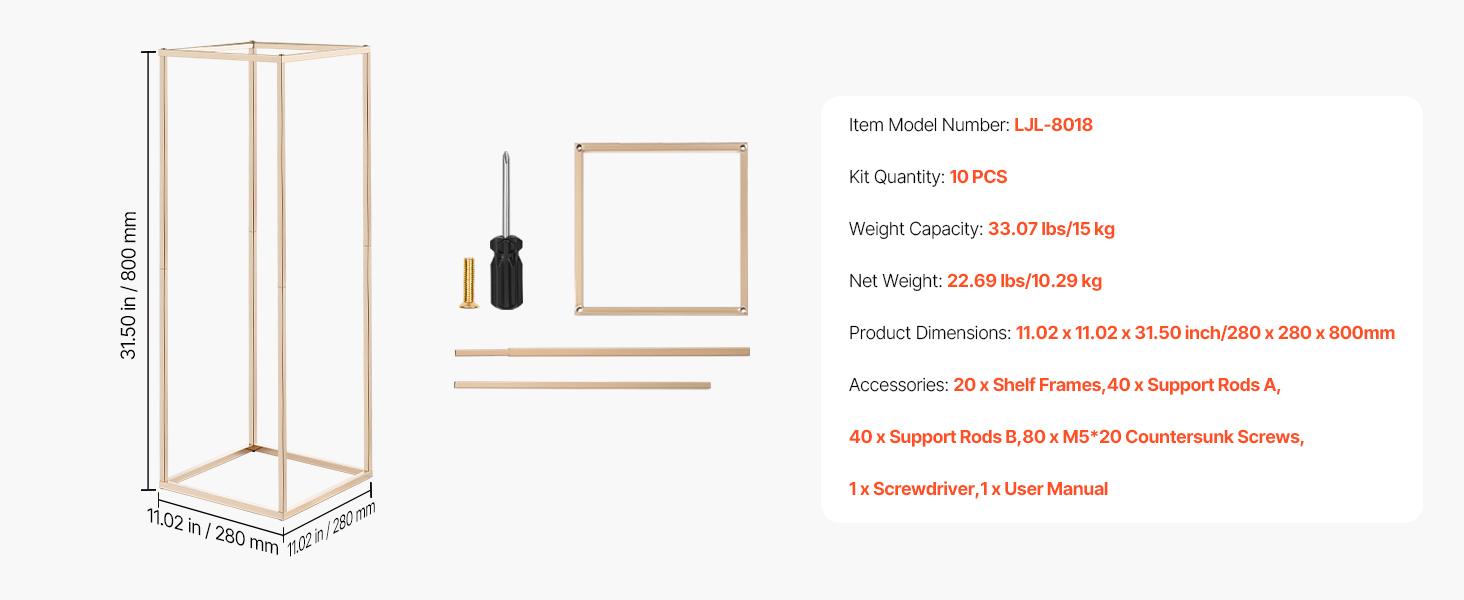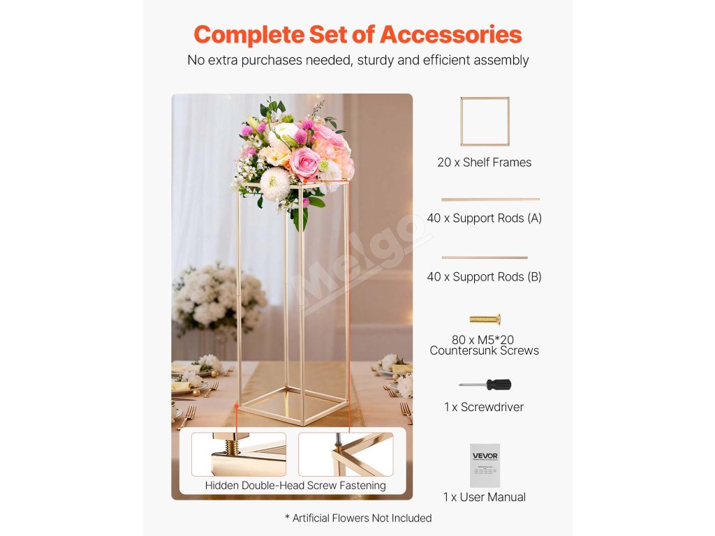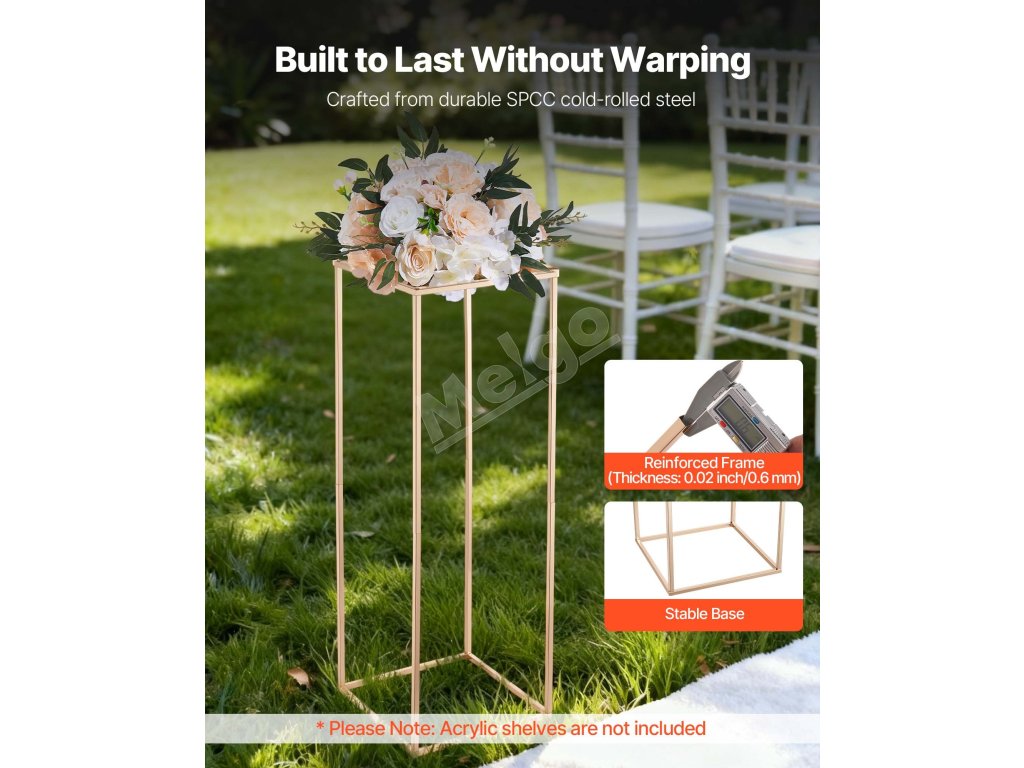 Tento kvetinový stojan s pevným za studena valcovaným rámom SPCC a stabilnou základňou unesie až 33,07 lbs/15 kg a umožňuje jednoduché vystavenie kvetov a dekorácií. Skryté skrutky vytvárajú čistý vzhľad a francúzske pozlátenie poskytuje trvalý lesk. Upozorňujeme, že akrylové police nie sú súčasťou balenia.