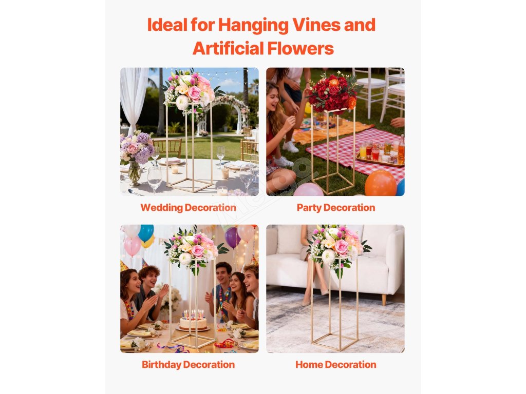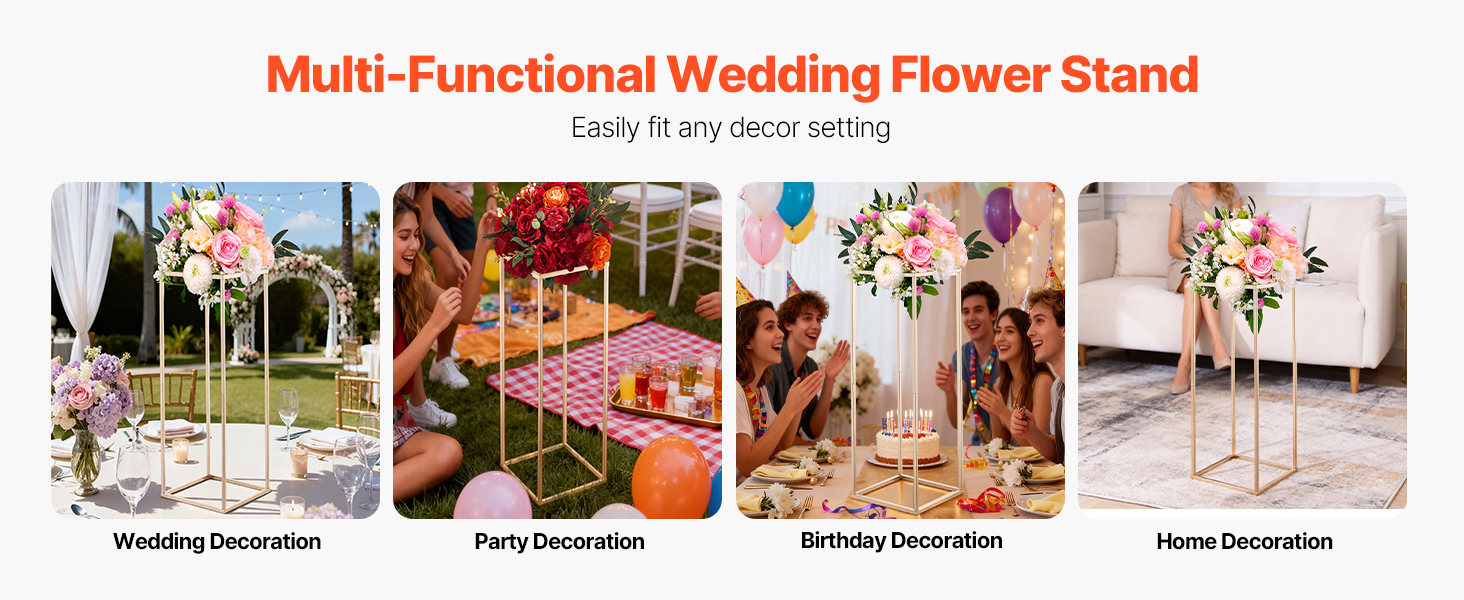 Tento zlatý stojan na kvetinový stred je vhodný na svadby, večierky, narodeniny a domáce dekorácie. Jeho elegantná estetika a funkčný dizajn umožňujú bezproblémové začlenenie do rôznych prostredí, vďaka čomu je všestrannou voľbou na pozdvihnutie vzhľadu vašich podujatí alebo obytných priestorov.