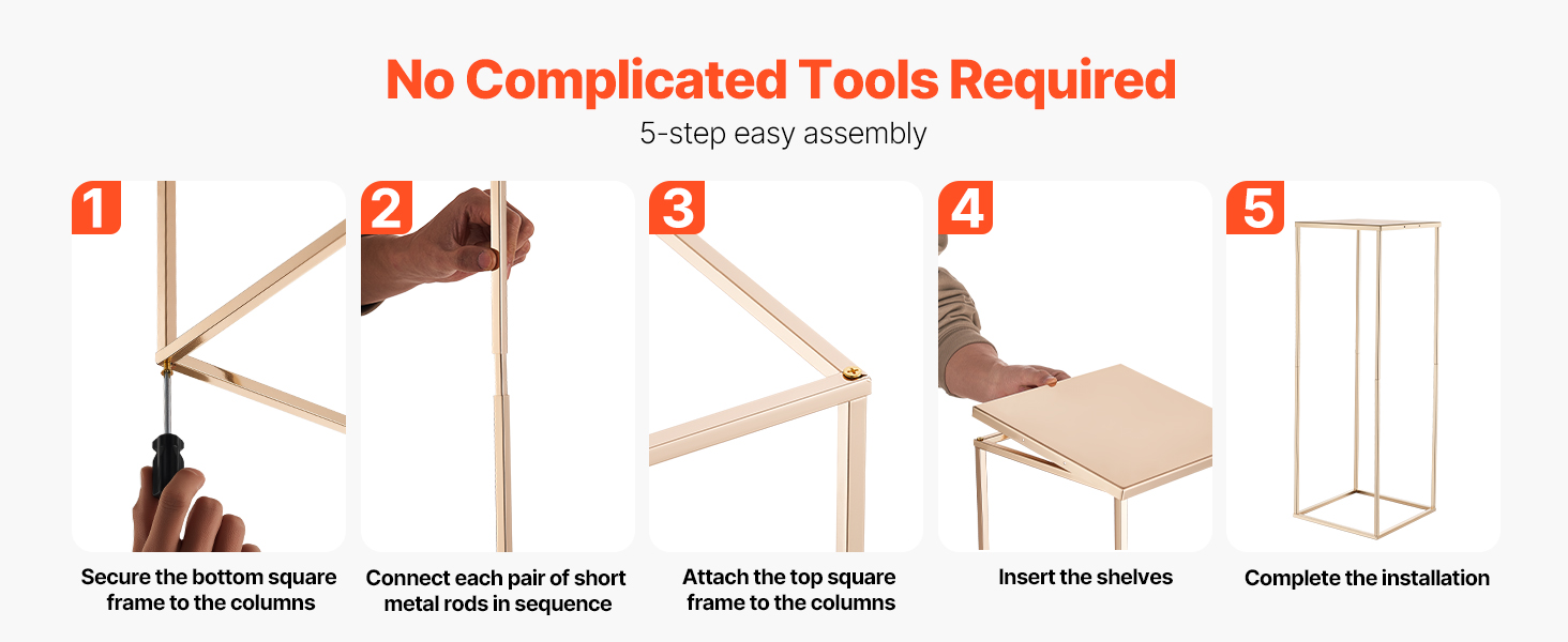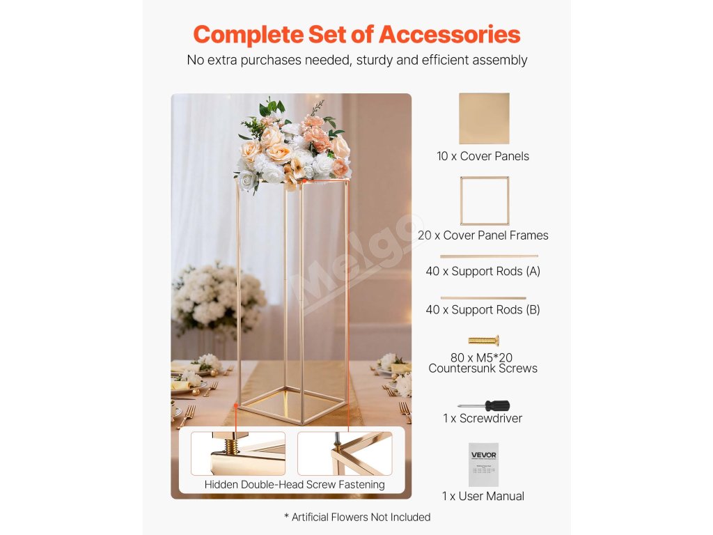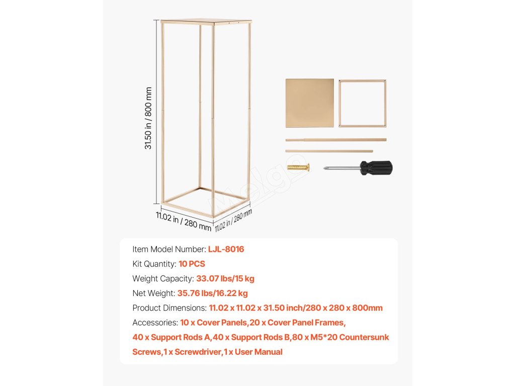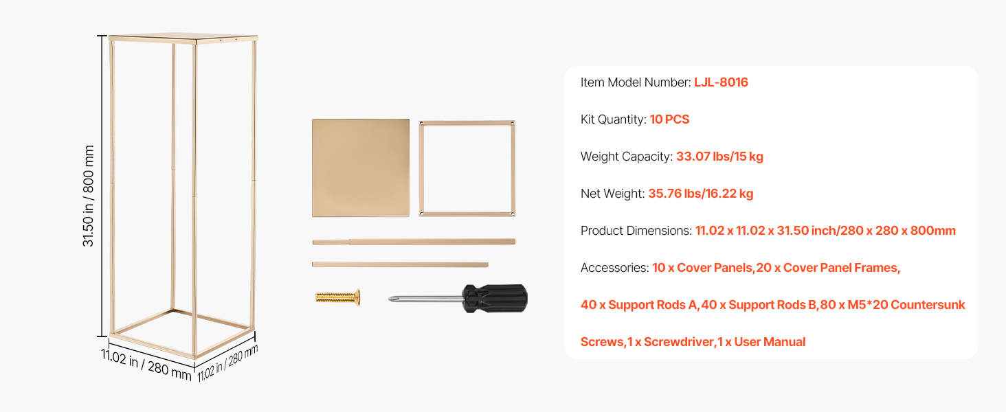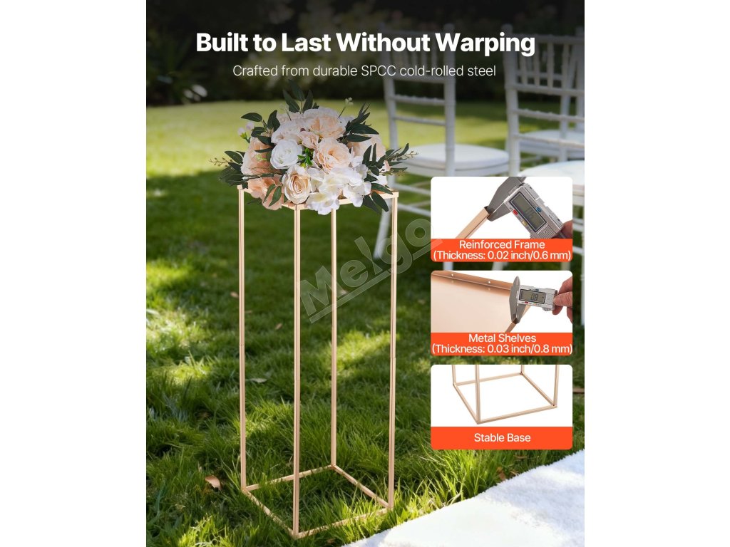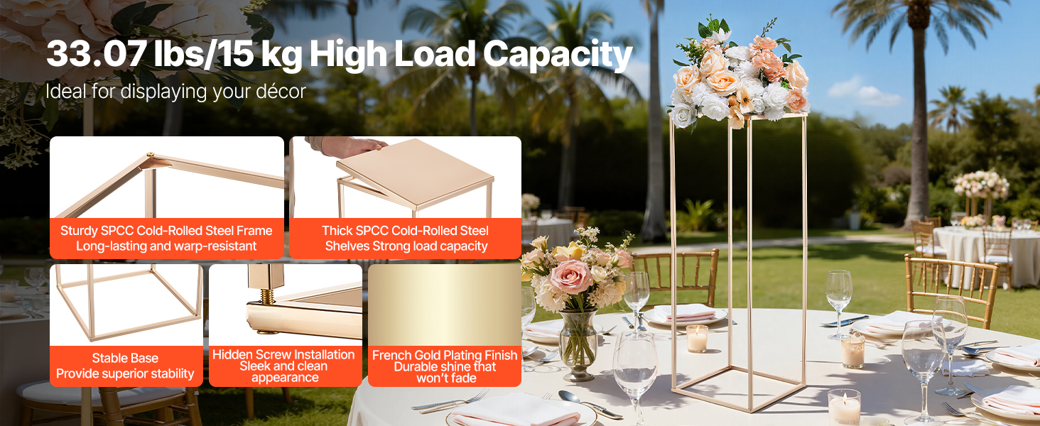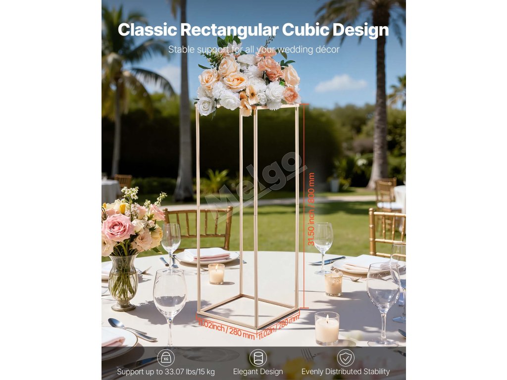 Tento svadobný stojan na kvety s klasickým obdĺžnikovým rámom z kociek udrží až 33,07 lbs/15 kg výzdoby. Hrubá oceľ SPCC, priehľadné akrylové police a francúzske pozlátenie vytvárajú odolný, elegantný stojan. Kompletné príslušenstvo umožňuje rýchlu montáž, takže je ideálny na svadby, večierky a domáce dekorácie.