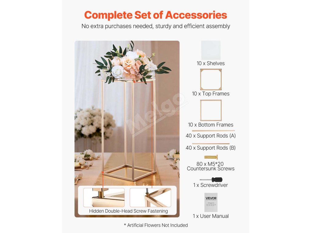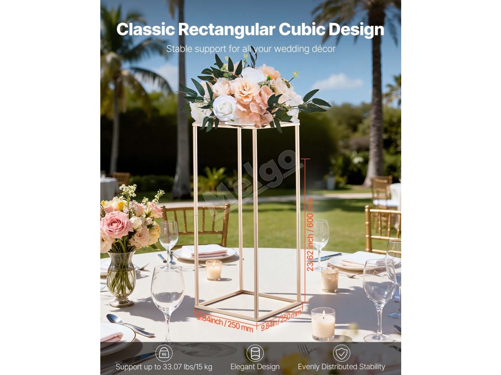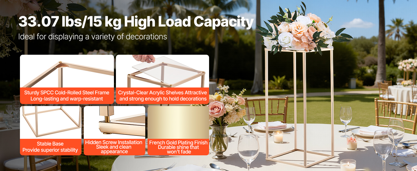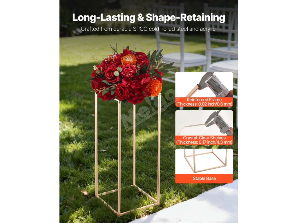 Vylepšite svoje podujatia týmto 10-dielnym svadobným stojanom na kvety. Obdĺžnikový rám z kocky unesie až 33,07 lbs/15 kg, je vyrobený z robustnej ocele SPCC a priehľadných akrylových políc s povrchovou úpravou vo francúzskom zlate. Kompletné komponenty umožňujú jednoduchú montáž, ideálne na svadby, narodeniny, oslavy alebo do domácnosti.