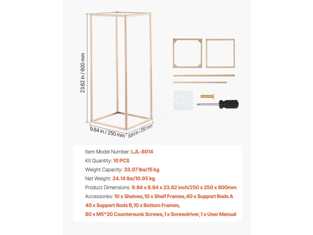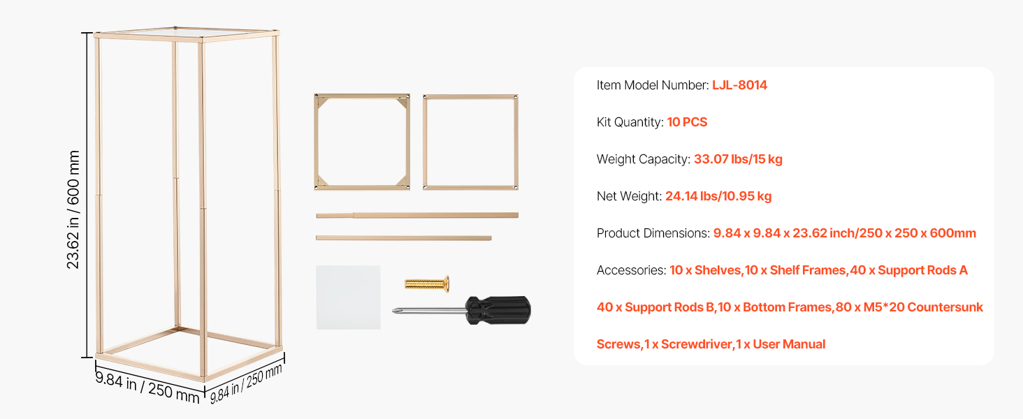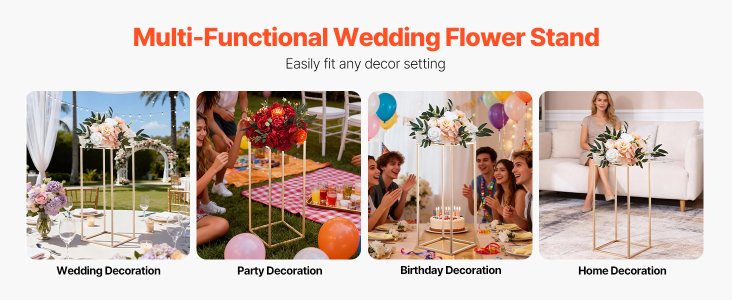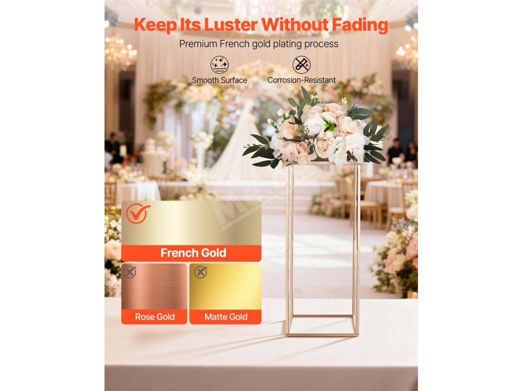 Vylepšite svoje podujatia týmto 10-dielnym svadobným stojanom na kvety. Obdĺžnikový rám z kocky unesie až 33,07 lbs/15 kg, je vyrobený z robustnej ocele SPCC a priehľadných akrylových políc s povrchovou úpravou vo francúzskom zlate. Kompletné komponenty umožňujú jednoduchú montáž, ideálne na svadby, narodeniny, oslavy alebo do domácnosti.