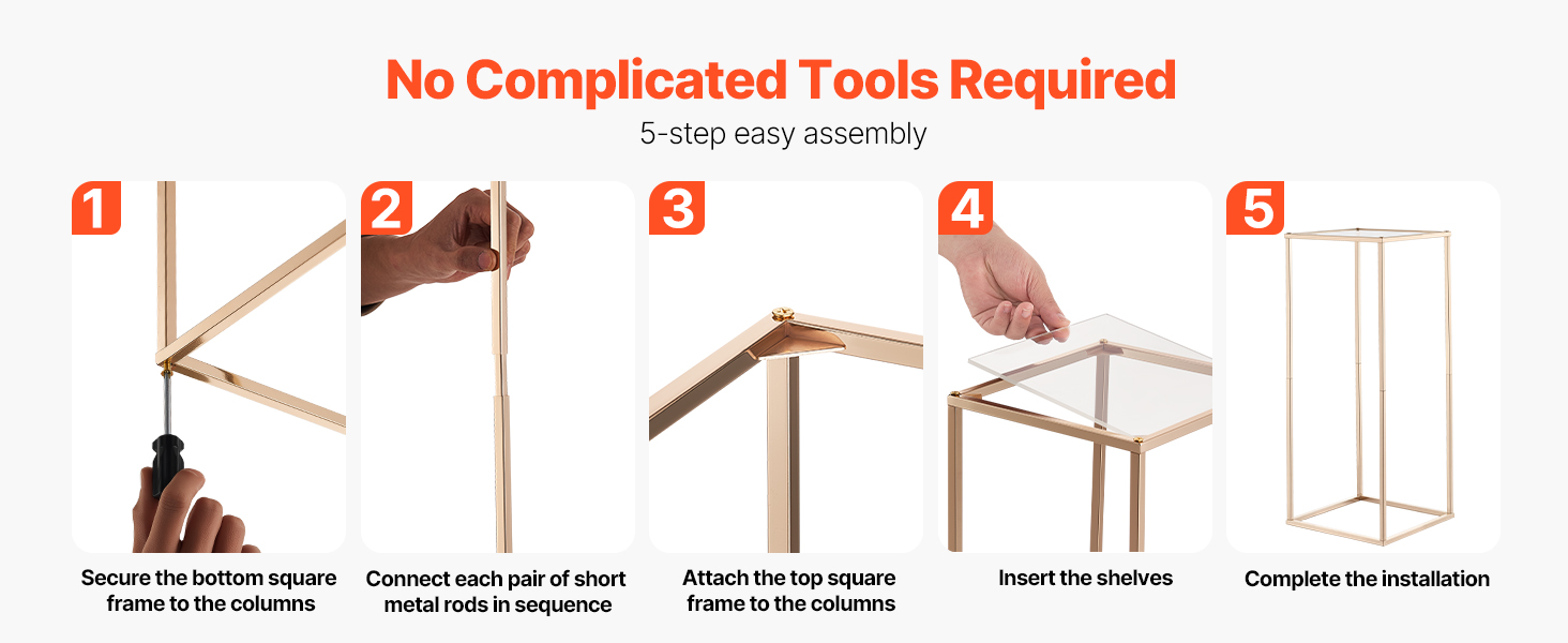 Montáž tohto stojana na stĺpy s kvetmi je rýchla a jednoduchá a nevyžaduje žiadne zložité nástroje. Jeho intuitívny dizajn umožňuje každému, vrátane začiatočníkov v oblasti domácich majstrov, dokončiť nastavenie v priebehu niekoľkých minút, vďaka čomu je vystavovanie kvetov alebo dekorácií na svadbách, večierkoch, narodeninách alebo domácich podujatiach bezproblémové.