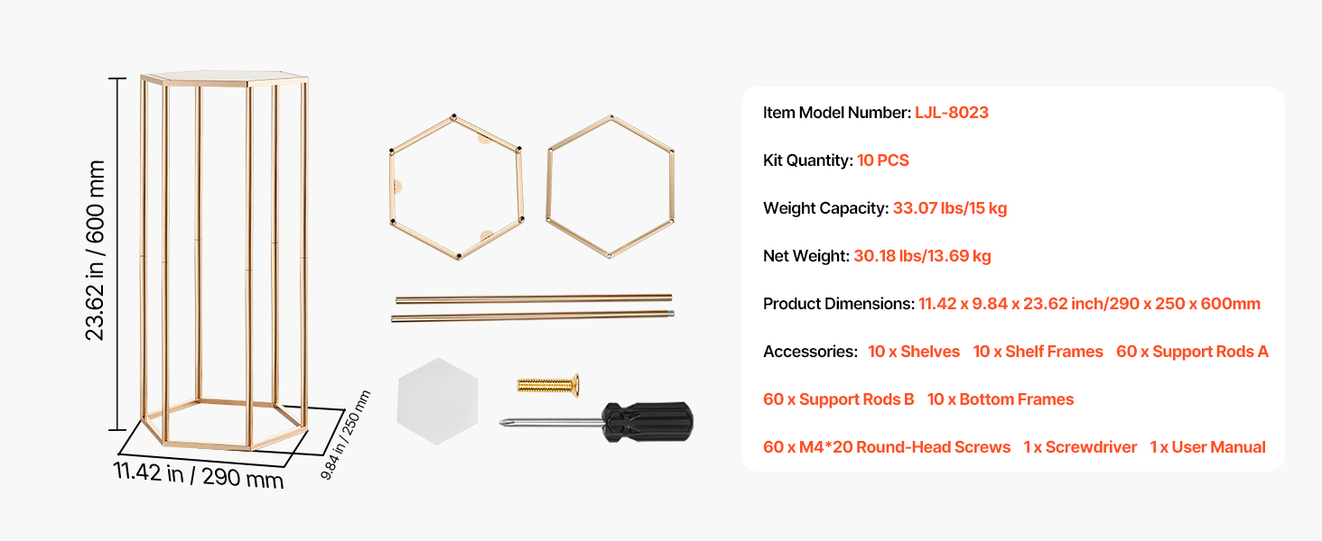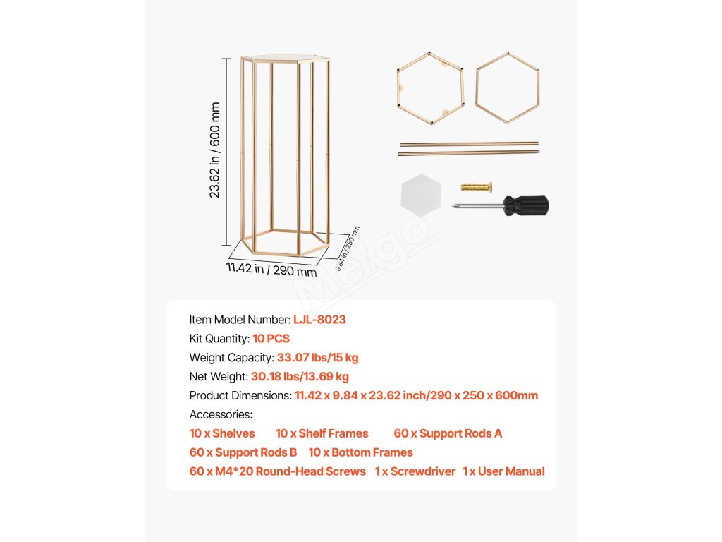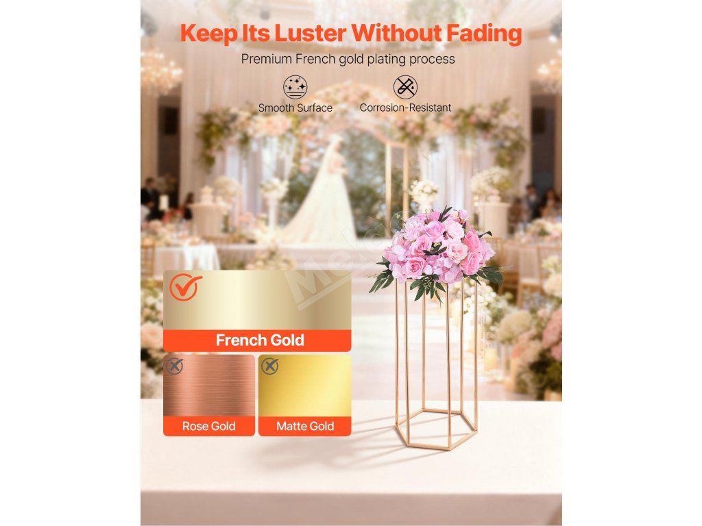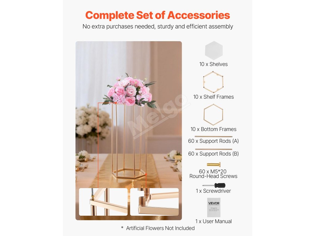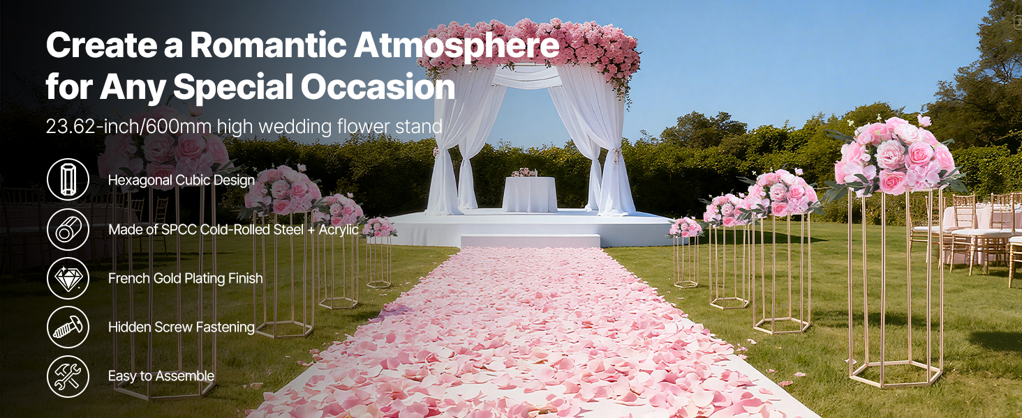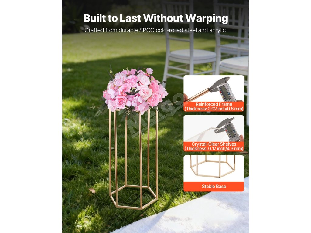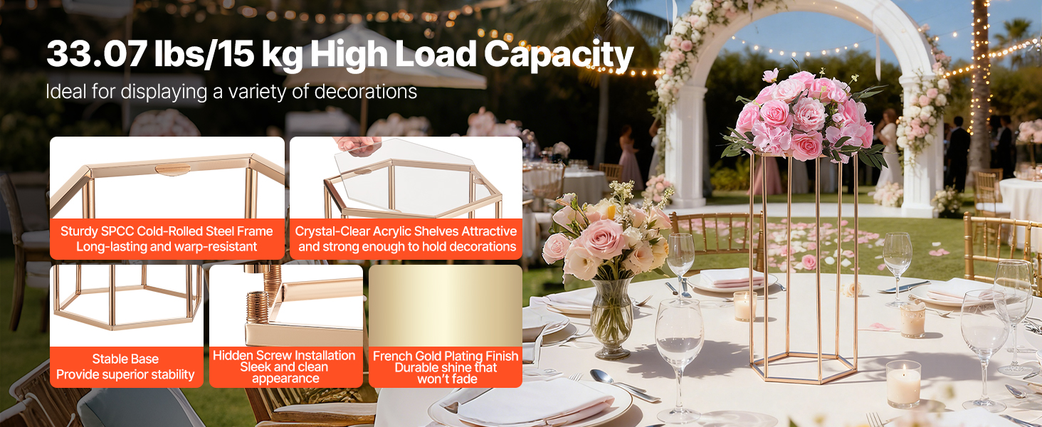 Náš svadobný stojan na kvety má dizajn šesťuholníkovej kocky, ktorý vyvažuje stabilitu a štýl a udrží 33,07 lbs/15 kg. Hrubá SPCC oceľ a priehľadné akrylové vrstvy poskytujú pevnosť a eleganciu, zvýraznenú francúzskym pozlátením. Súčasťou balenia je všetko príslušenstvo na rýchlu montáž na svadby, večierky alebo výzdobu.