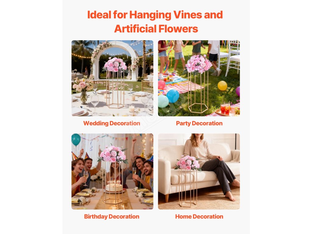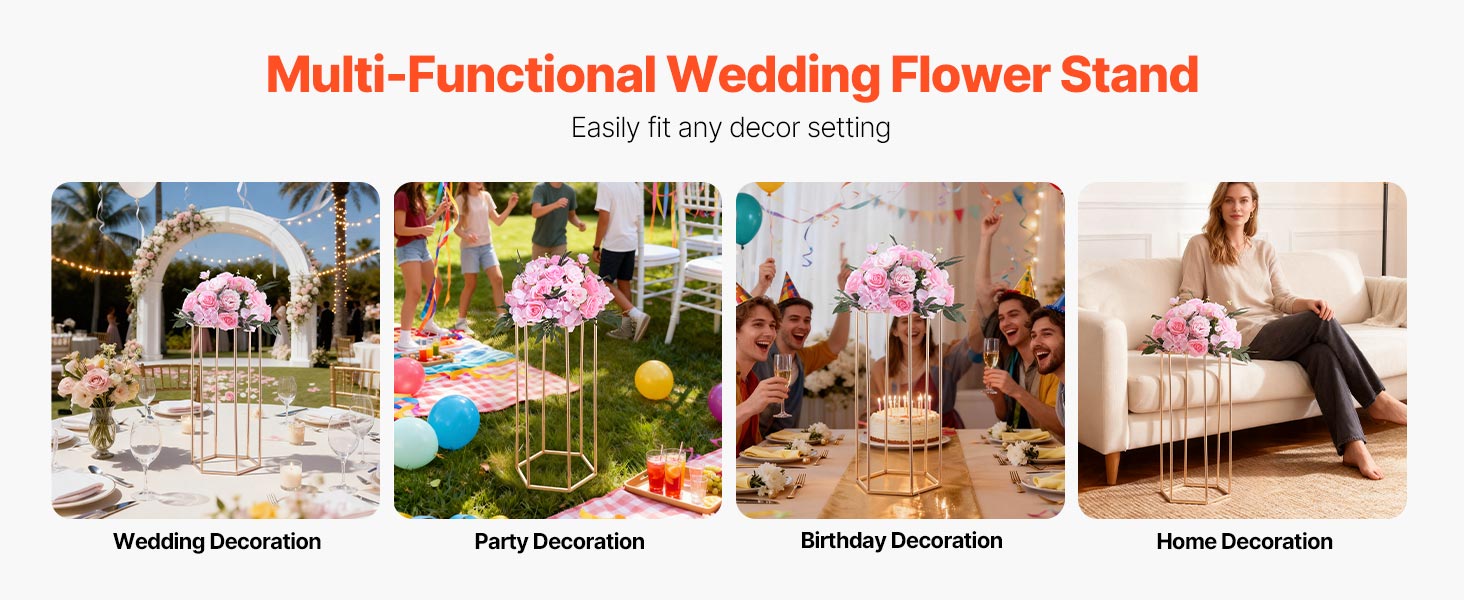 Či už ide o svadby, oslavy, narodeniny alebo domácu výzdobu, tento stojan na stĺpové kvety VEVOR sa ľahko prispôsobí rôznym nastaveniam. Jeho elegantný vzhľad a praktická funkčnosť z neho robia vynikajúcu voľbu na zvýraznenie krásy akéhokoľvek priestoru.