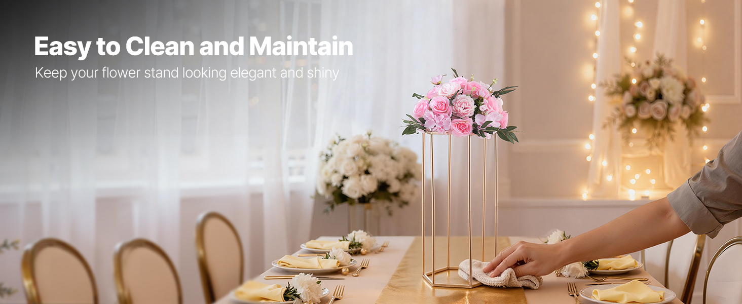 Vďaka hladkému, jemnému povrchu sa tento stĺpový stojan na vázy ľahko čistí a udržiava. Pri každodennom používaní alebo pri špeciálnych príležitostiach ho jednoducho utrite, aby ste odstránili prach a škvrny, a udržujte jeho elegantný vzhľad s dlhotrvajúcim leskom.