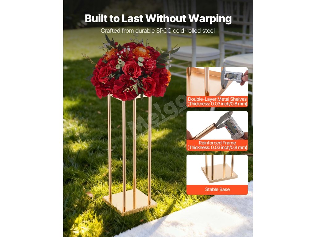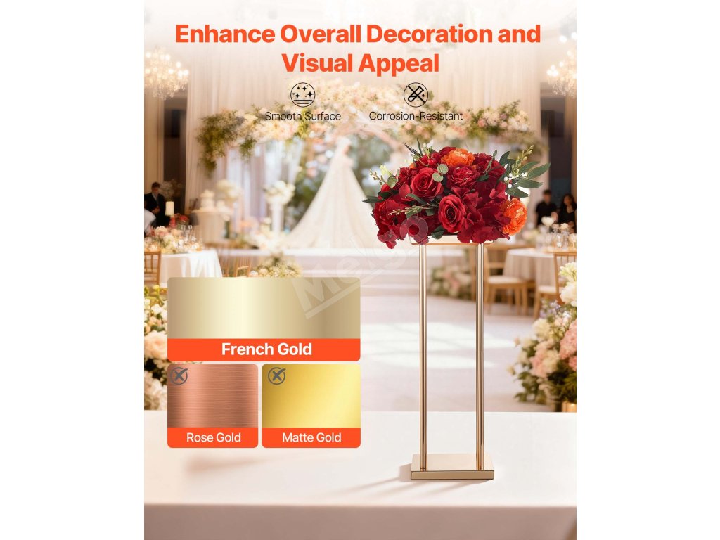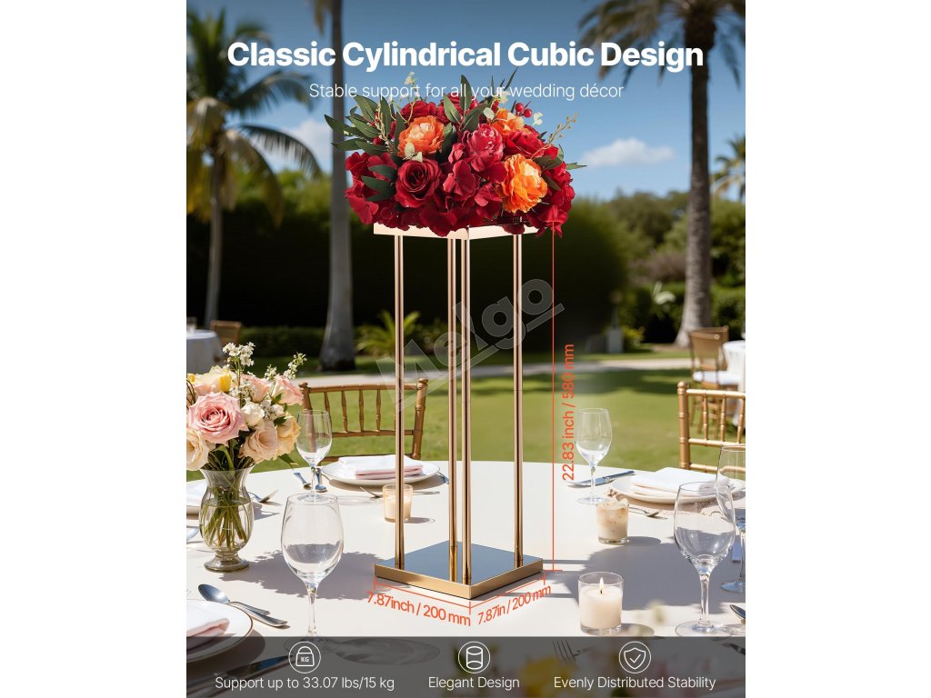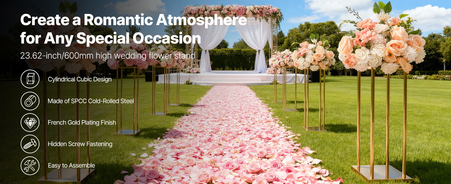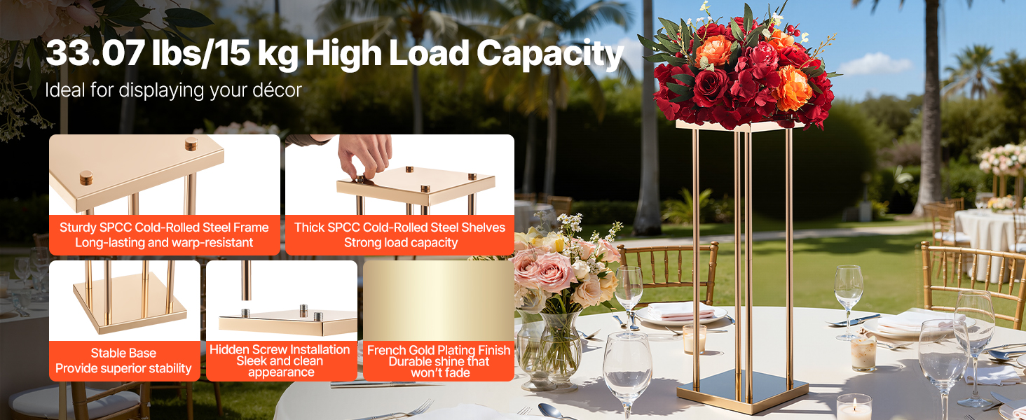 Náš svadobný stojan na kvety kombinuje klasický dizajn kocky so zosilneným rámom SPCC a dvojvrstvovými panelmi pre stabilitu a nosnosť až 33,07 lbs/15 kg. Krásu zvýrazňuje francúzske zlaté galvanické pokovovanie. Kompletné príslušenstvo zabezpečuje jednoduchú montáž na svadby, oslavy, narodeniny alebo domáce dekorácie.