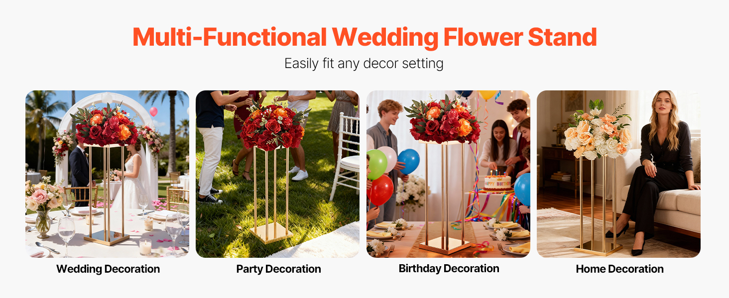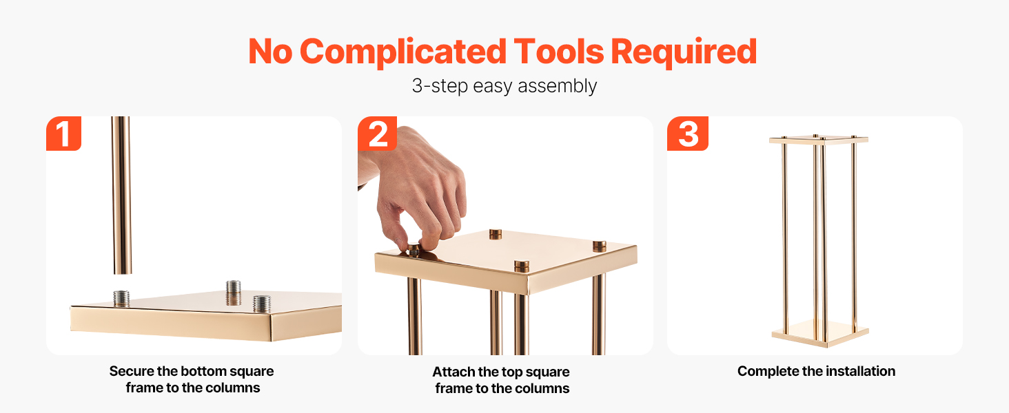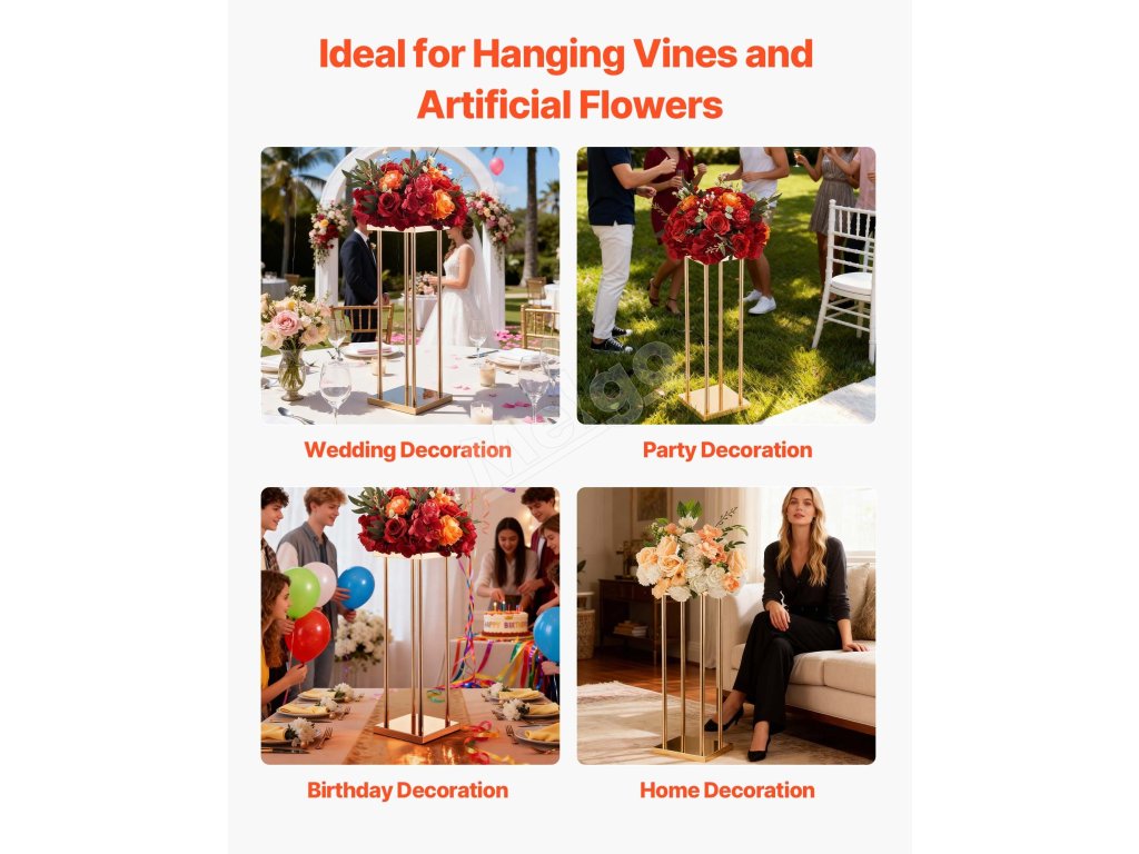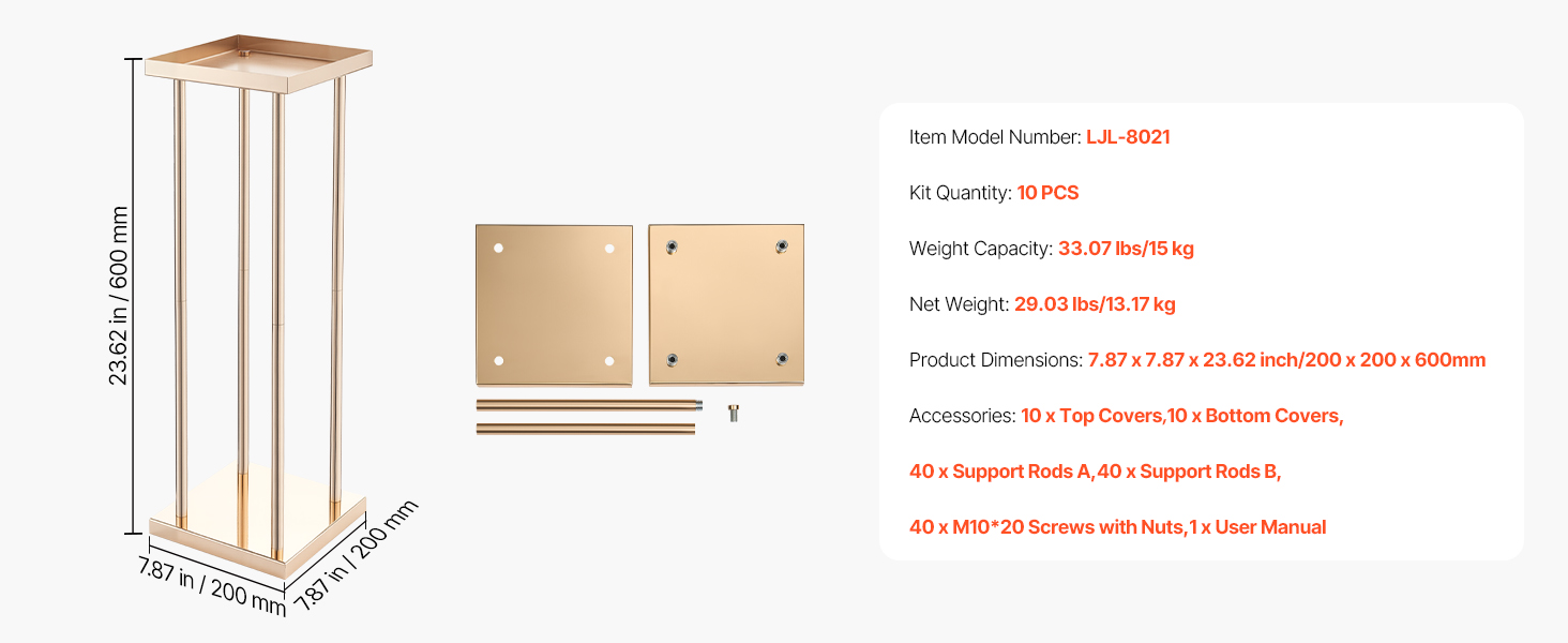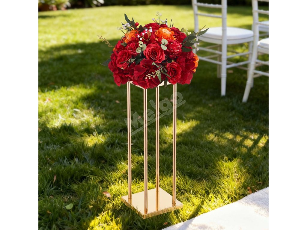 Náš svadobný stojan na kvety kombinuje klasický dizajn kocky so zosilneným rámom SPCC a dvojvrstvovými panelmi pre stabilitu a nosnosť až 33,07 lbs/15 kg. Krásu zvýrazňuje francúzske zlaté galvanické pokovovanie. Kompletné príslušenstvo zabezpečuje jednoduchú montáž na svadby, oslavy, narodeniny alebo domáce dekorácie.