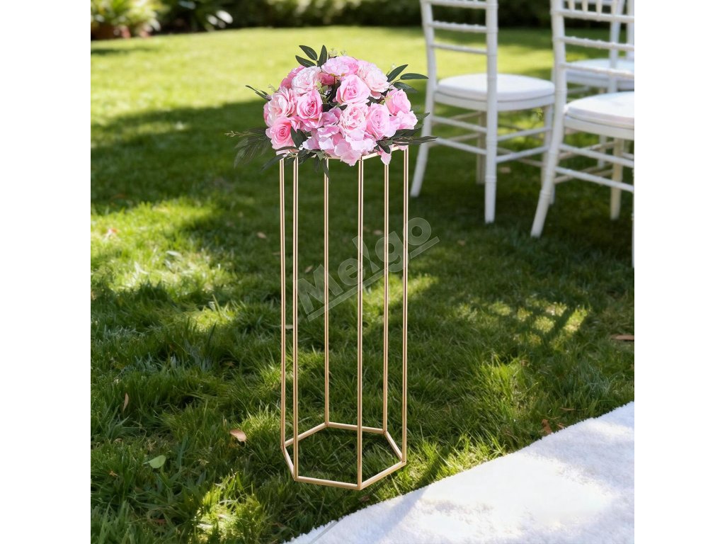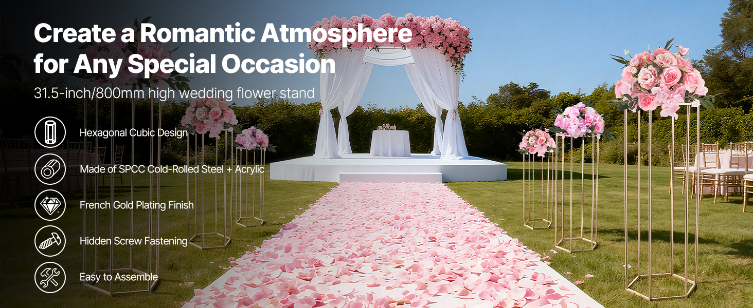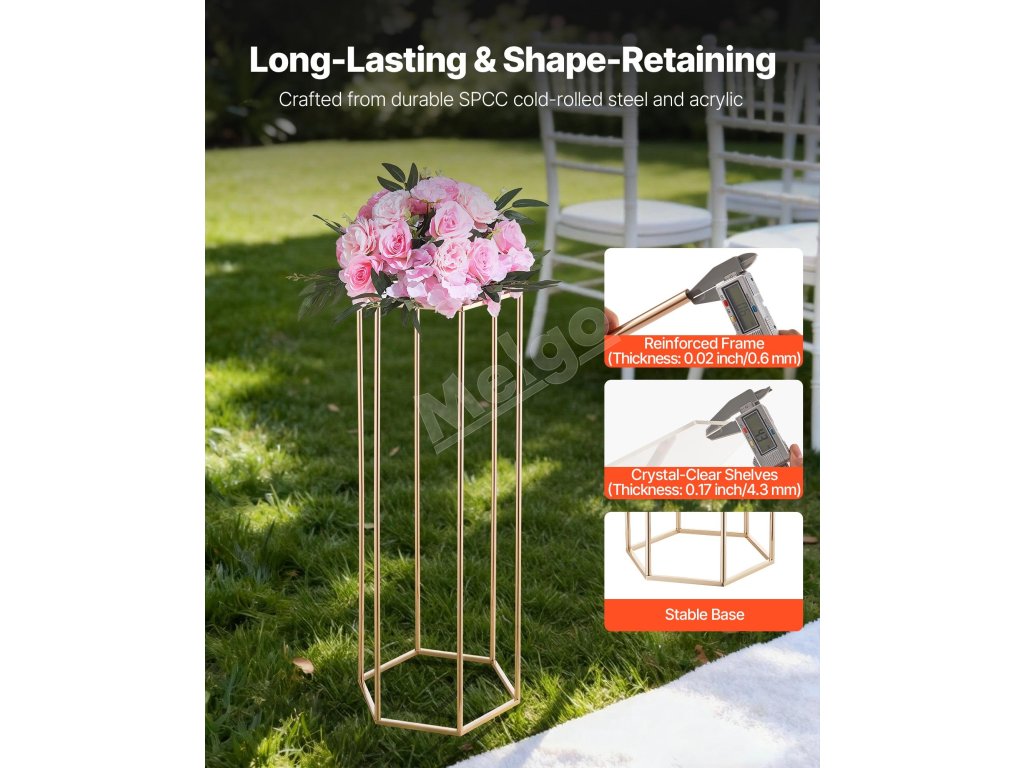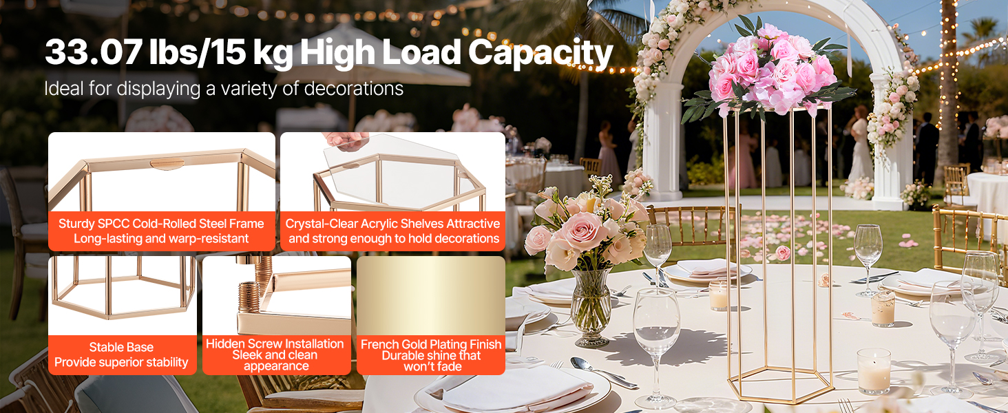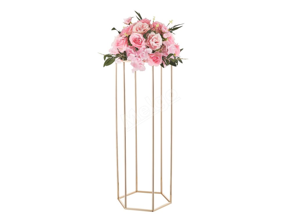 Náš svadobný stojan na kvety má dizajn šesťuholníkovej kocky, ktorý vyvažuje stabilitu a štýl a udrží 33,07 lbs/15 kg. Hrubá SPCC oceľ a priehľadné akrylové vrstvy poskytujú pevnosť a eleganciu, zvýraznenú francúzskym pozlátením. Súčasťou balenia je všetko príslušenstvo na rýchlu montáž na svadby, večierky alebo výzdobu.