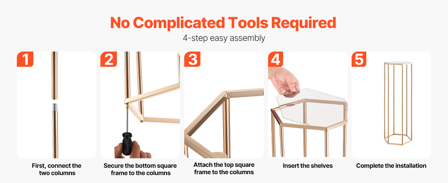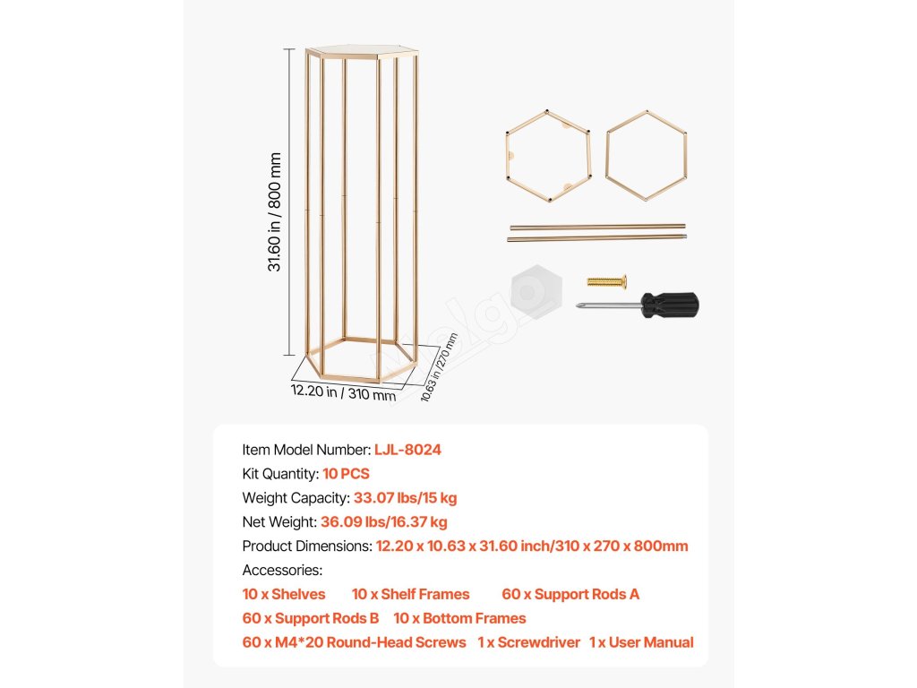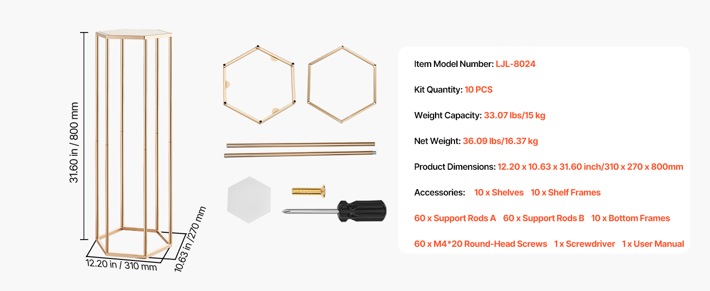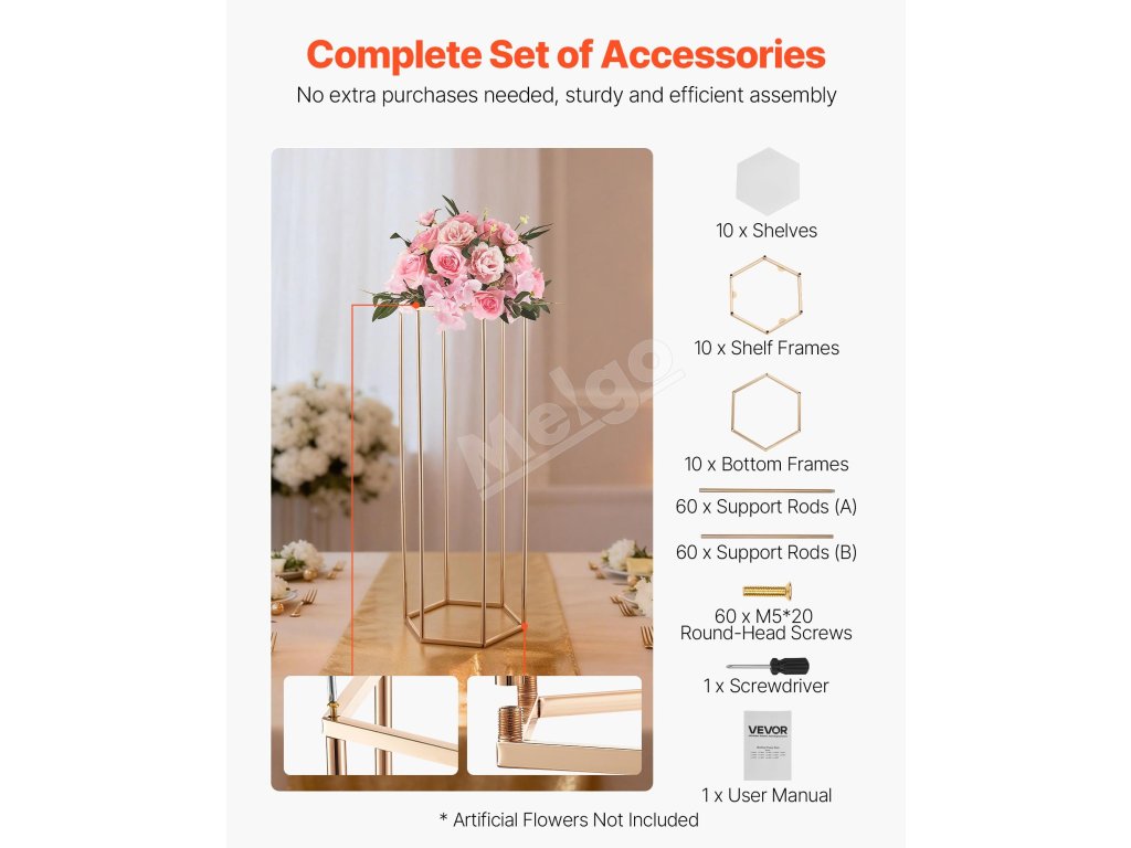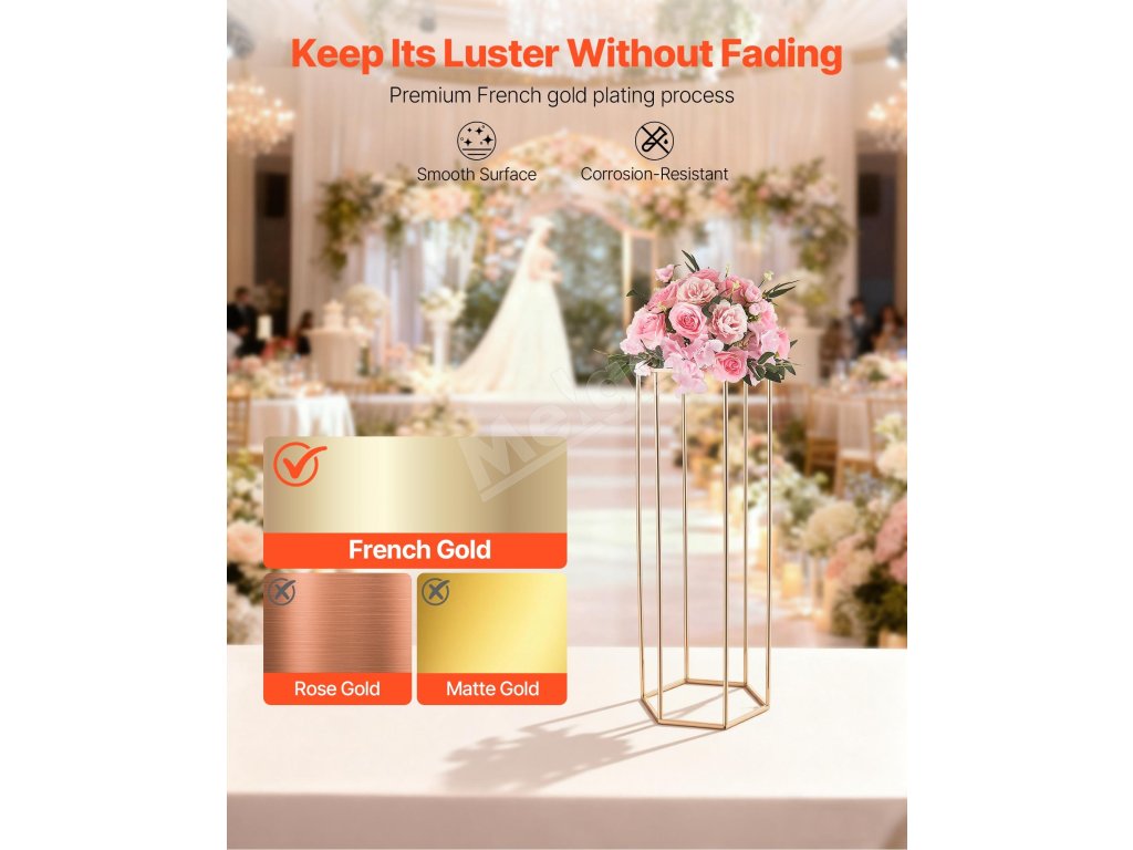 Náš svadobný stojan na kvety má dizajn šesťuholníkovej kocky, ktorý vyvažuje stabilitu a štýl a udrží 33,07 lbs/15 kg. Hrubá SPCC oceľ a priehľadné akrylové vrstvy poskytujú pevnosť a eleganciu, zvýraznenú francúzskym pozlátením. Súčasťou balenia je všetko príslušenstvo na rýchlu montáž na svadby, večierky alebo výzdobu.