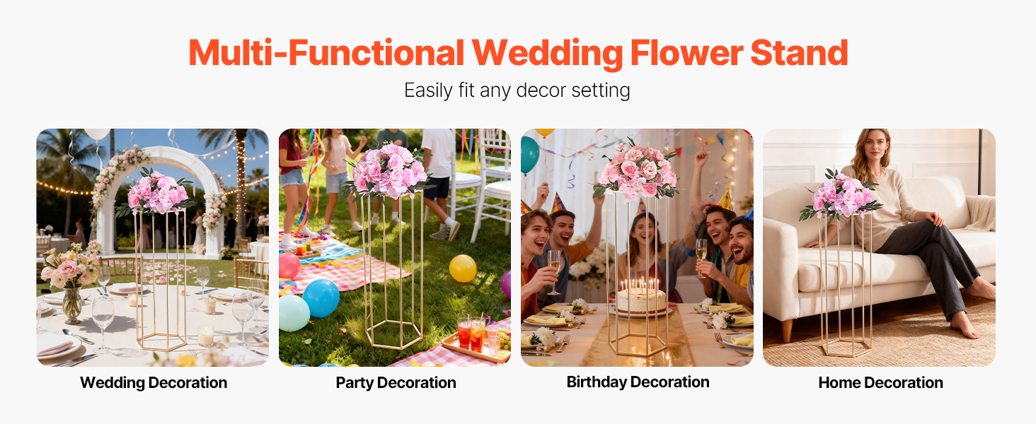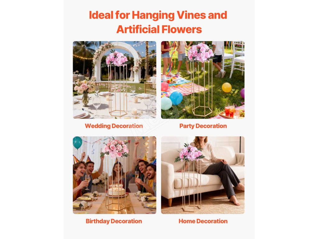 Či už ide o svadby, oslavy, narodeniny alebo domácu výzdobu, tento stojan na stĺpové kvety VEVOR sa ľahko prispôsobí rôznym nastaveniam. Jeho elegantný vzhľad a praktická funkčnosť z neho robia vynikajúcu voľbu na zvýraznenie krásy akéhokoľvek priestoru.