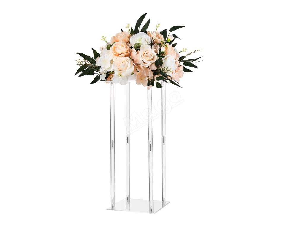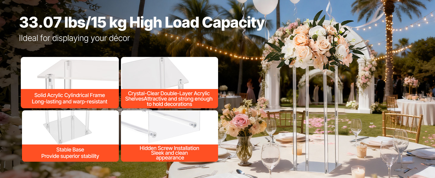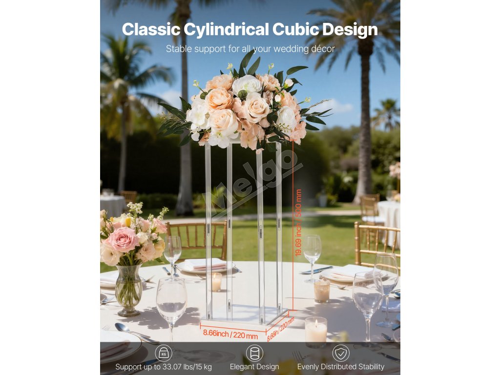 Tento svadobný stojan na kvety s klasickým dizajnom okrúhlej kocky unesie až 33,07 lbs/15 kg. Pevné akrylové valce s priehľadnými dvojvrstvovými panelmi poskytujú pevnosť a eleganciu. Skryté skrutky a dvojité upevňovacie prvky ho udržiavajú v poriadku a priložené príslušenstvo umožňuje rýchlu montáž na svadobnú výzdobu.
