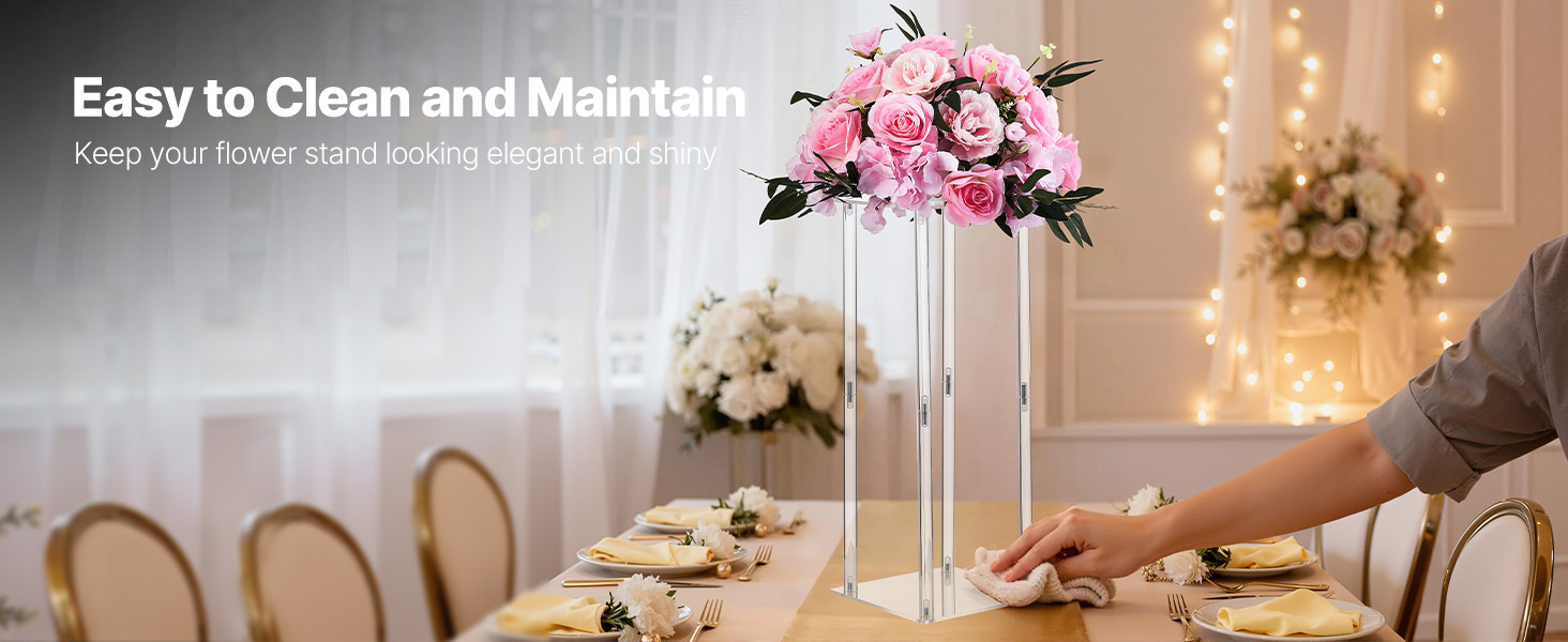 Vďaka hladkému povrchu umožňuje tento stojan na stĺpové vázy bezproblémové čistenie a údržbu. Jednoduchým utretím sa odstráni prach a škvrny, čím sa zachová jeho rafinovaný vzhľad a trvalý lesk na svadby, oslavy, narodeniny a domáce dekorácie.