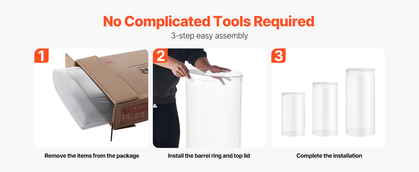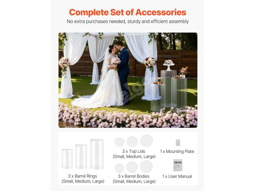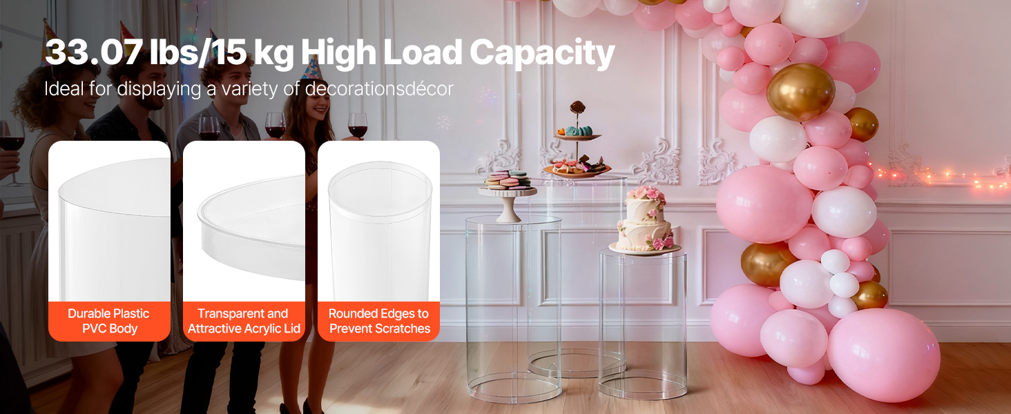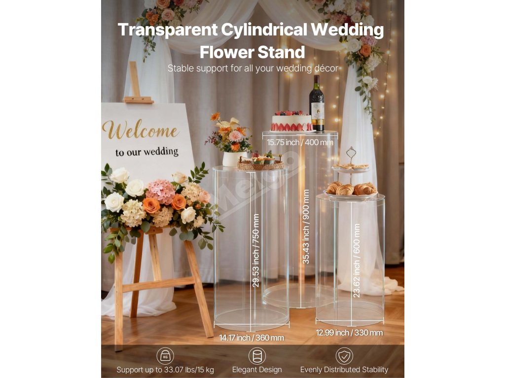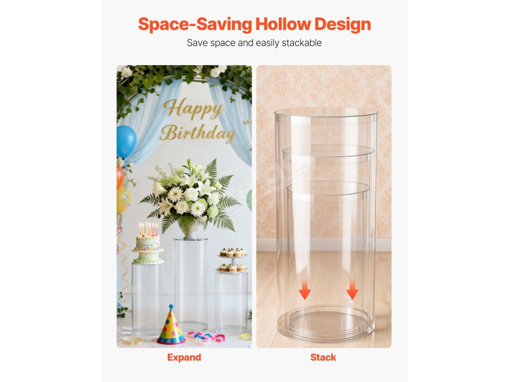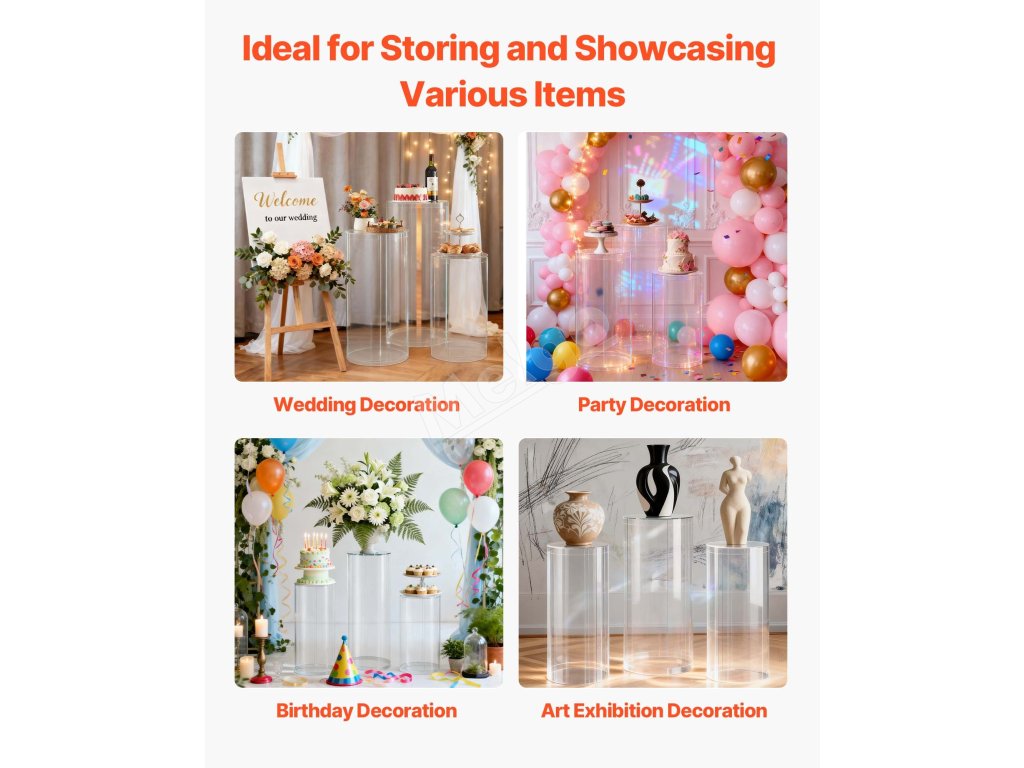 Vďaka používateľsky prívetivému dizajnu sa tento priehľadný valcový podstavec zostaví za niekoľko minút - nie je potrebné žiadne náradie. Každá časť sa spája hladko, čo umožňuje jednoduché nastavenie aj pre začiatočníkov v oblasti domácich majstrov. Ušetrite drahocenný čas a energiu a zároveň vytvorte elegantné dekoratívne zvýraznenie na svadbách, večierkoch a výstavách.