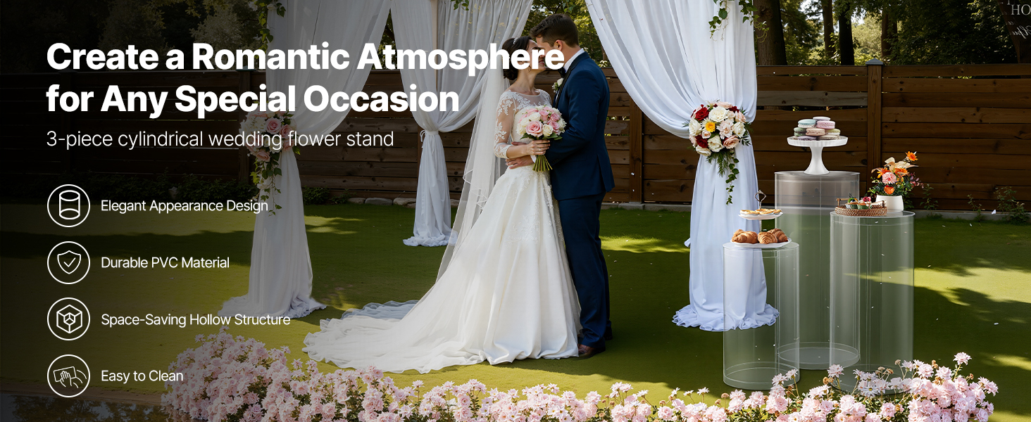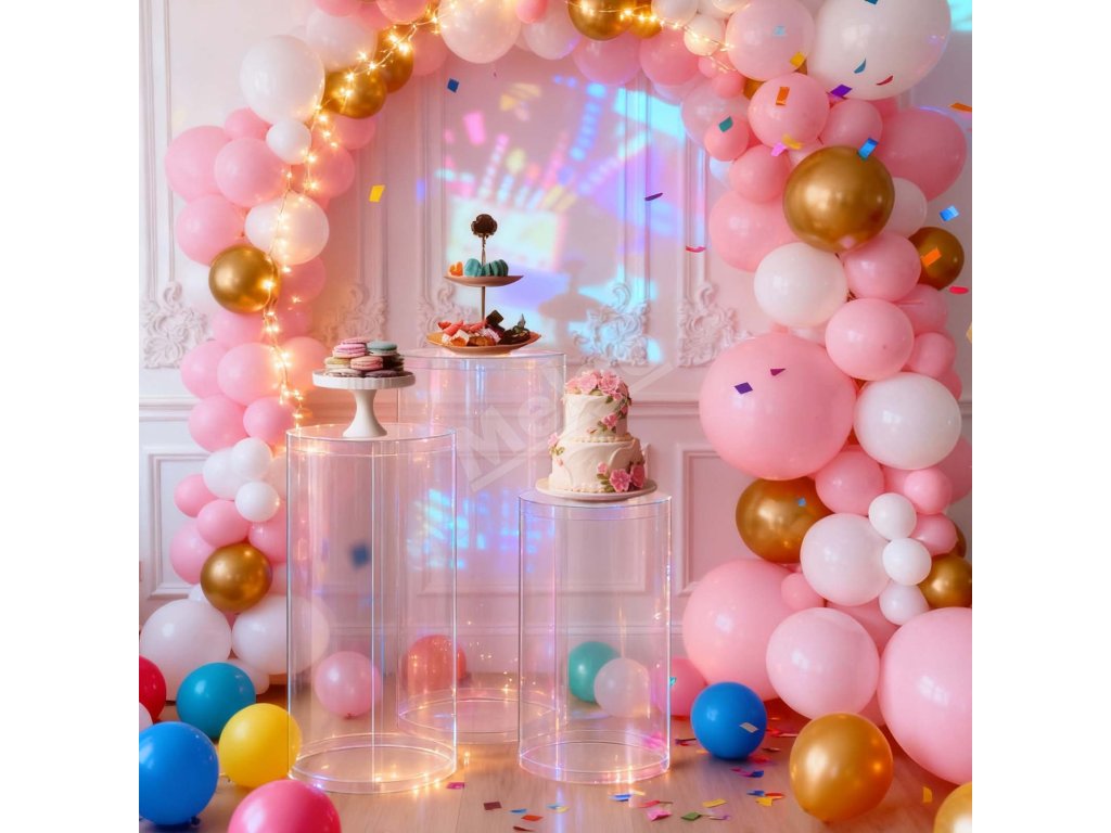 Táto sada troch okrúhlych priehľadných svadobných stojanov na kvety spája modernú jednoduchosť s trvalou pevnosťou. Vďaka konštrukcii z PVC a akrylu, hladkým okrajom a jednoduchému stohovaniu unesie až 33 kg a krásne sa hodí na svadby, večierky alebo umelecké výstavy.