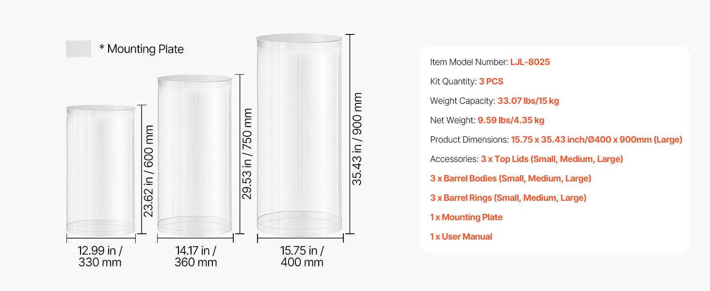 | Rozmery výrobku | 15.75 x 35,43 palca/Ø400 x 900 mm (veľký) |