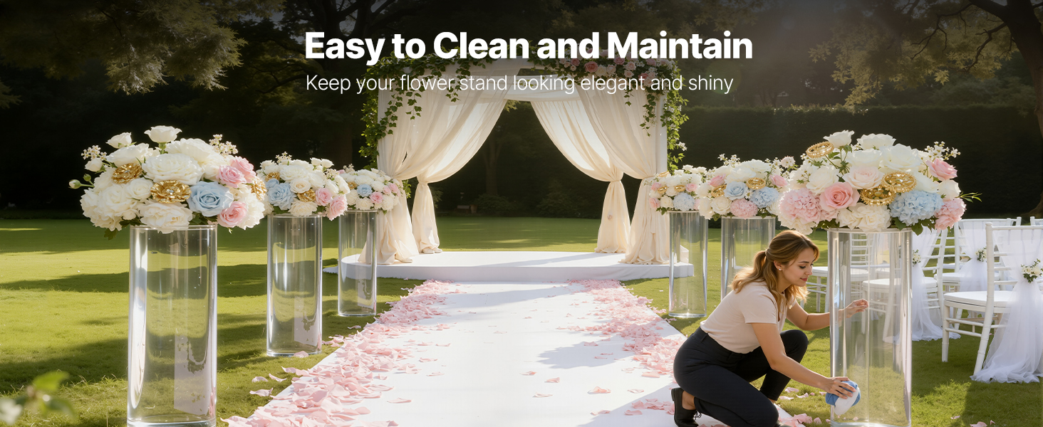 Tento priehľadný podstavec s hladkým a elegantným povrchom ponúka rýchlu a jednoduchú údržbu. Prach a odtlačky prstov možno odstrániť v priebehu chvíľky, čo zaručuje žiarivý a pôvabný vzhľad. Vhodný na svadby, večierky alebo domáce dekorácie, udrží vašu expozíciu zakaždým vyleštenú a atraktívnu.