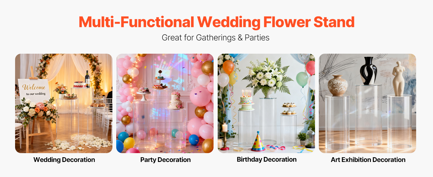Tento stĺpový stojan VEVOR sa hodí na rôzne príležitosti, od svadieb a večierkov až po narodeniny a umelecké výstavy. Jeho elegantný dizajn a praktická konštrukcia sa bez problémov začlenia do akejkoľvek témy alebo výzdoby a dodajú mu rafinovaný nádych, ktorý umocní celkovú atmosféru vašej výnimočnej udalosti.