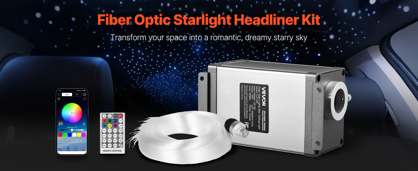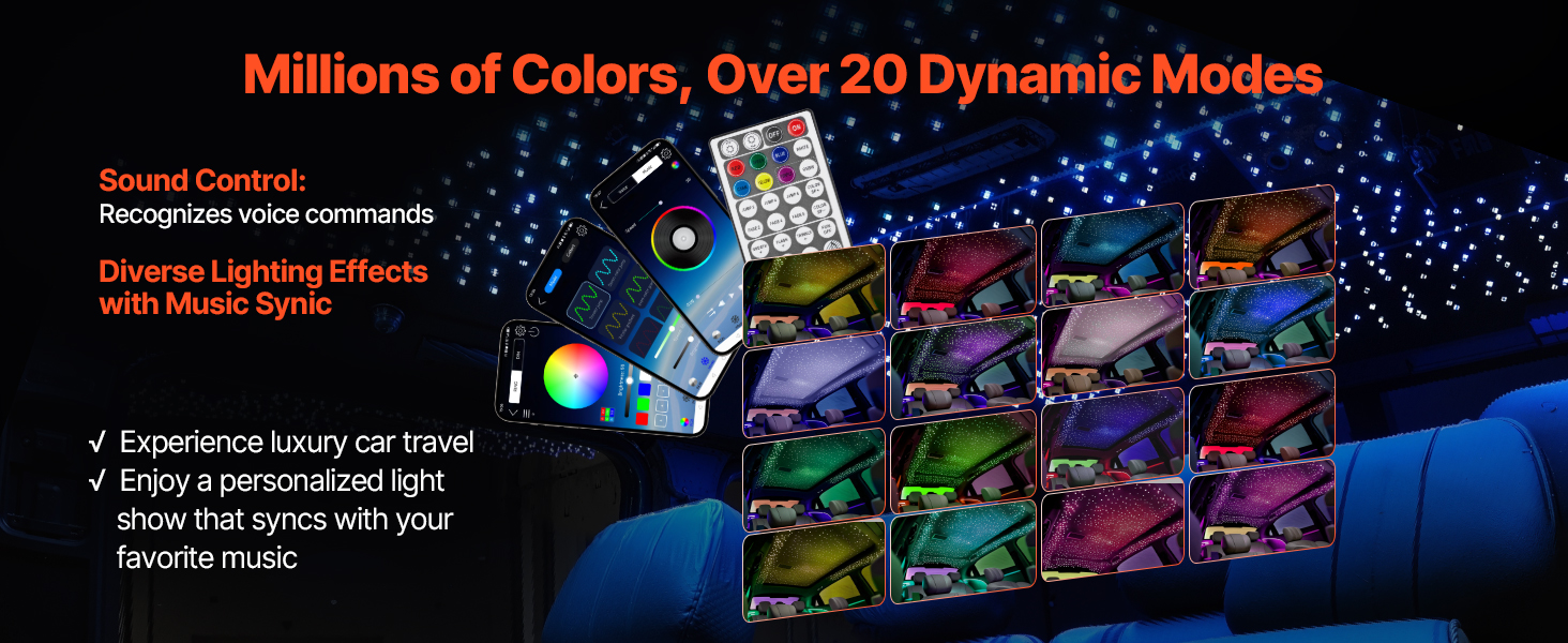 Táto sada starlight headliner podporuje diaľkové ovládanie a ovládanie prostredníctvom aplikácie Bluetooth, vďaka čomu môžete ľahko prepínať medzi 20 dynamickými farebnými režimami. Vytvorená z 450 ks 9,8 ft optických káblov a vysokovýkonného svetelného zdroja vytvára pohlcujúcu atmosféru, ktorá pripomína živú svetelnú show.