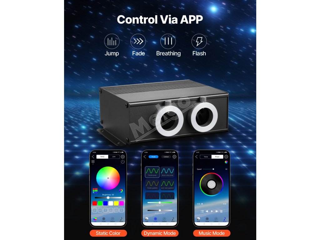 Táto súprava hviezdicového svetlometu podporuje diaľkové ovládanie a ovládanie pomocou aplikácie Bluetooth, vďaka čomu môžete jednoducho prepínať medzi 20 dynamickými farebnými režimami. Vyrobená z 900 ks 9,8 ft optických káblov a vysokovýkonného svetelného motora vytvára pohlcujúcu atmosféru, ktorá pripomína živú svetelnú šou.