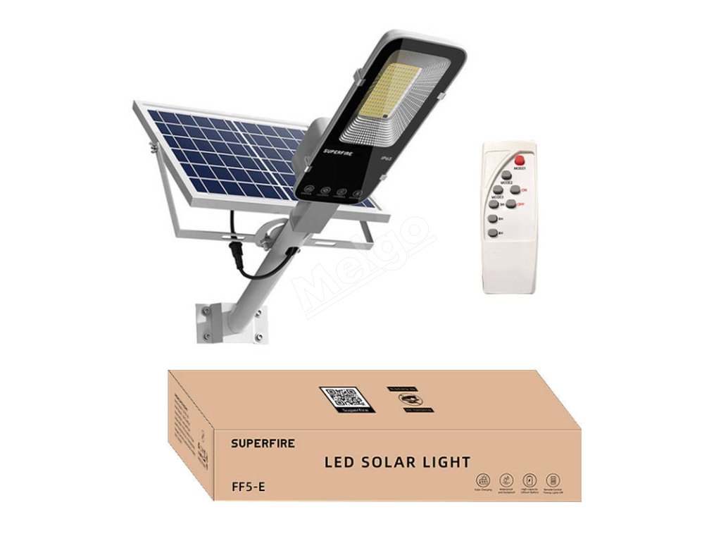 Čerpajte energiu zo slnečných lúčov! Lampa Superfire je kombináciou energeticky účinného a bezpečného osvetlenia, ktoré integruje inteligentné technológie ovládania. FF5-E bude dobre fungovať ako pouličné, priemyselné alebo komerčné osvetlenie. Použitie materiálov odolných voči poškodeniu a pokročilá technológia napájania PWM zabezpečuje vysokú účinnosť v prostredí s nízkou teplotou. Svietidlo môžete ovládať pomocou diaľkového ovládača (je súčasťou dodávky).