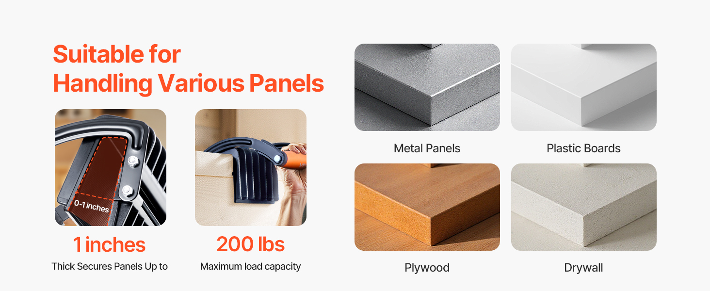 Či už prenášate kov, preglejku, plast alebo sadrokartónové dosky, naše nosiče sadrokartónu zvládnu materiály s hmotnosťou do 200 kg a hrúbkou 1 palec. Ideálne riešenie pre rôzne stavebné materiály!