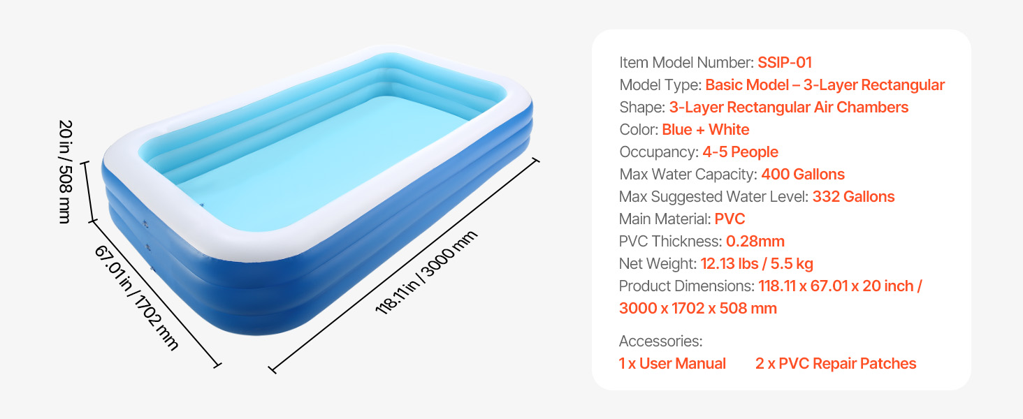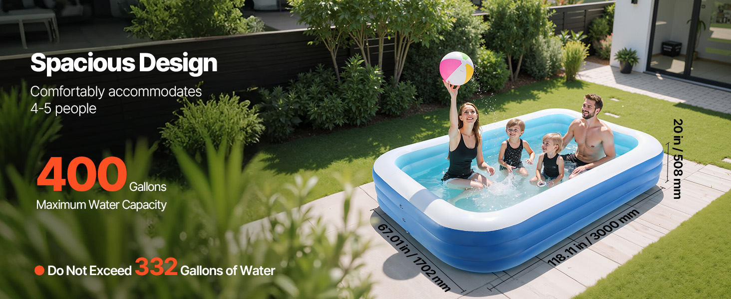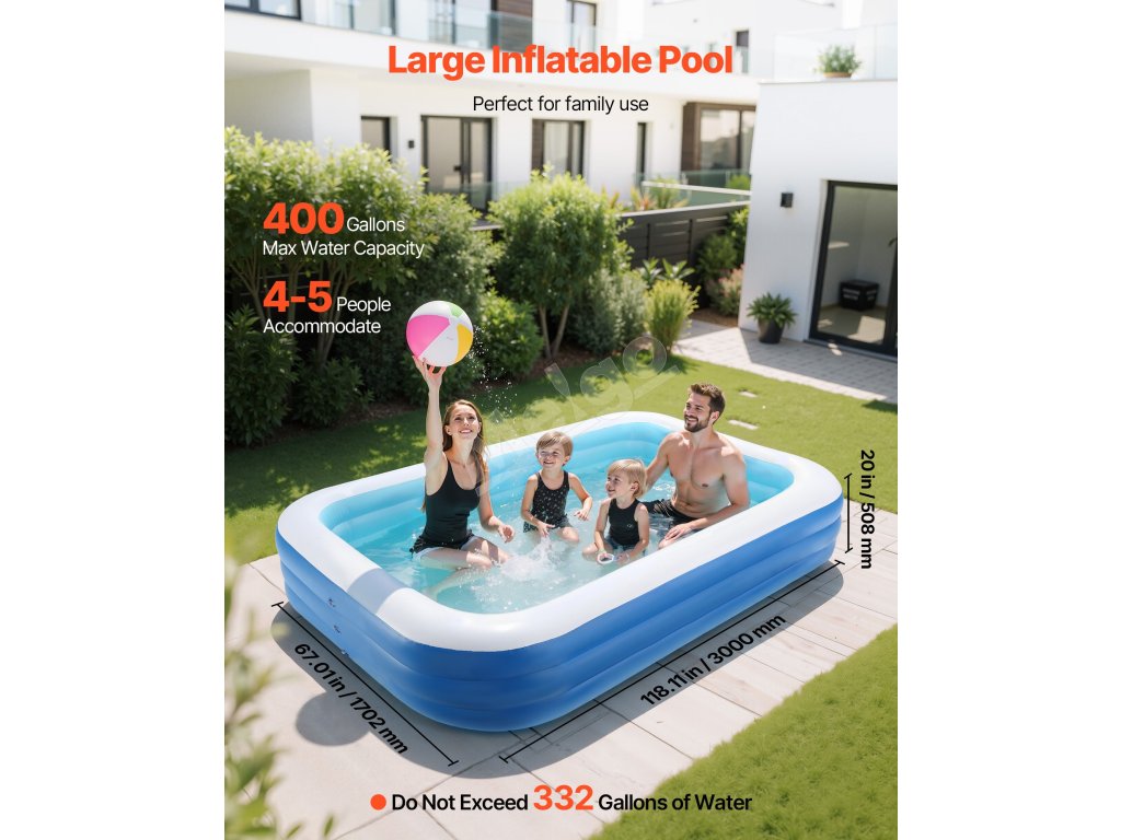 Tento veľký nafukovací bazén má rozmery 118 x 67 x 20 palcov a objem 400 galónov. Odporúčané naplnenie nie je väčšie ako 332 galónov. Je vyrobený z odolného, vysokokvalitného PVC, má 3 vzduchové komory, ventily odolné proti úniku vody a uľahčuje rýchle vypúšťanie vody prostredníctvom rúrky v tvare L s uhlom 90°. Ideálny na zábavu na dvore.