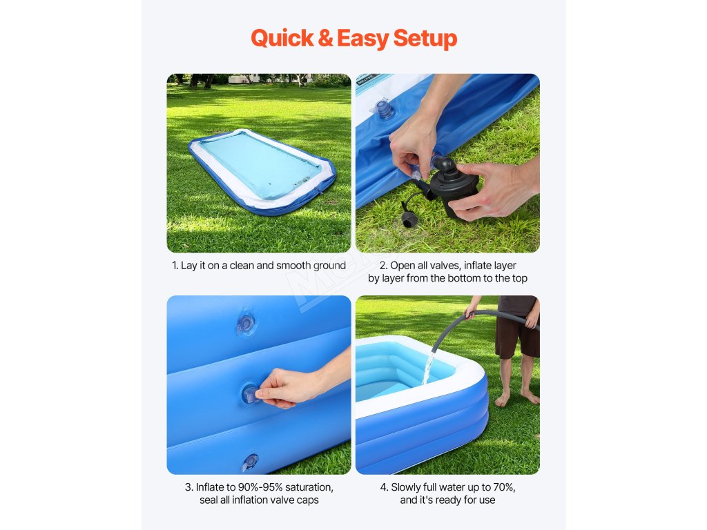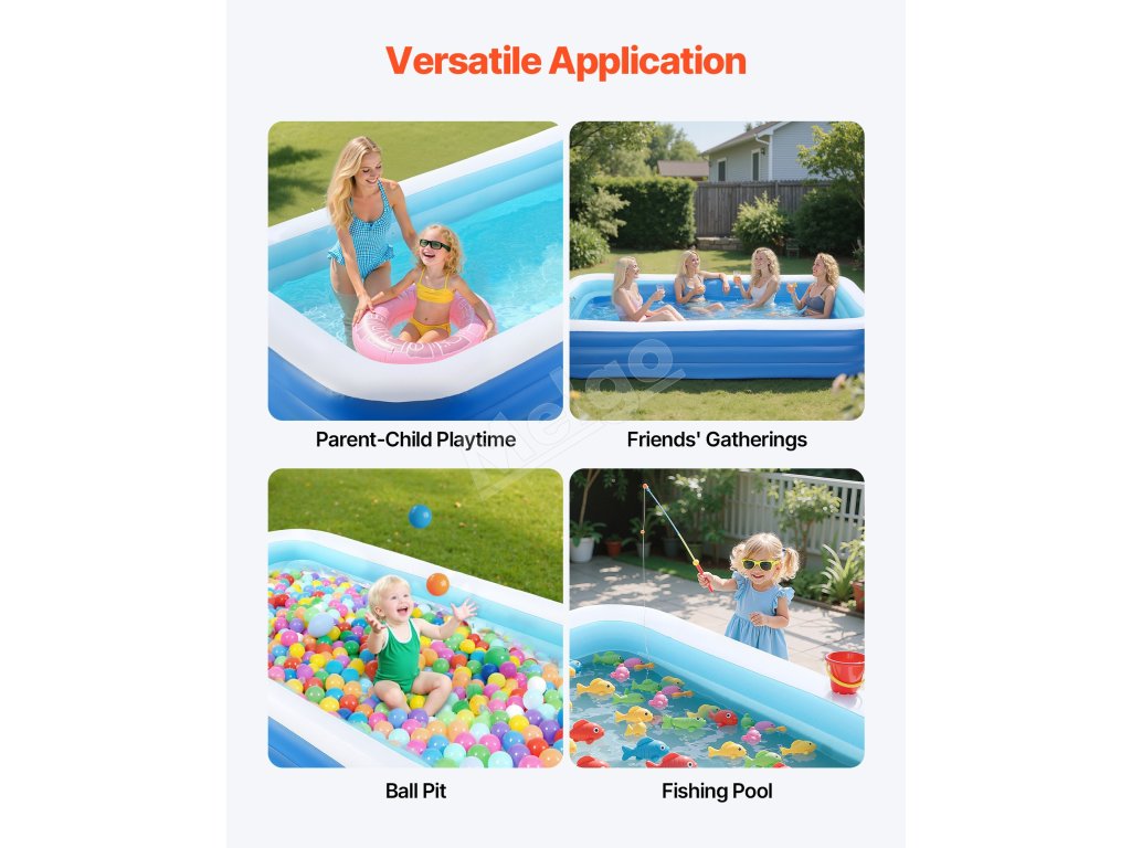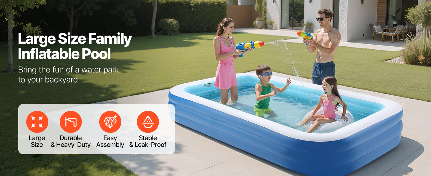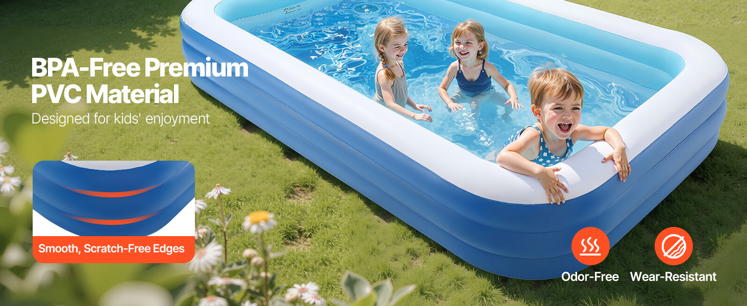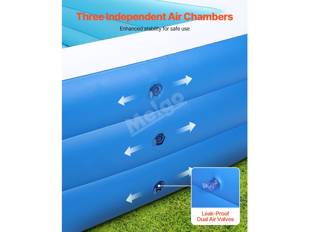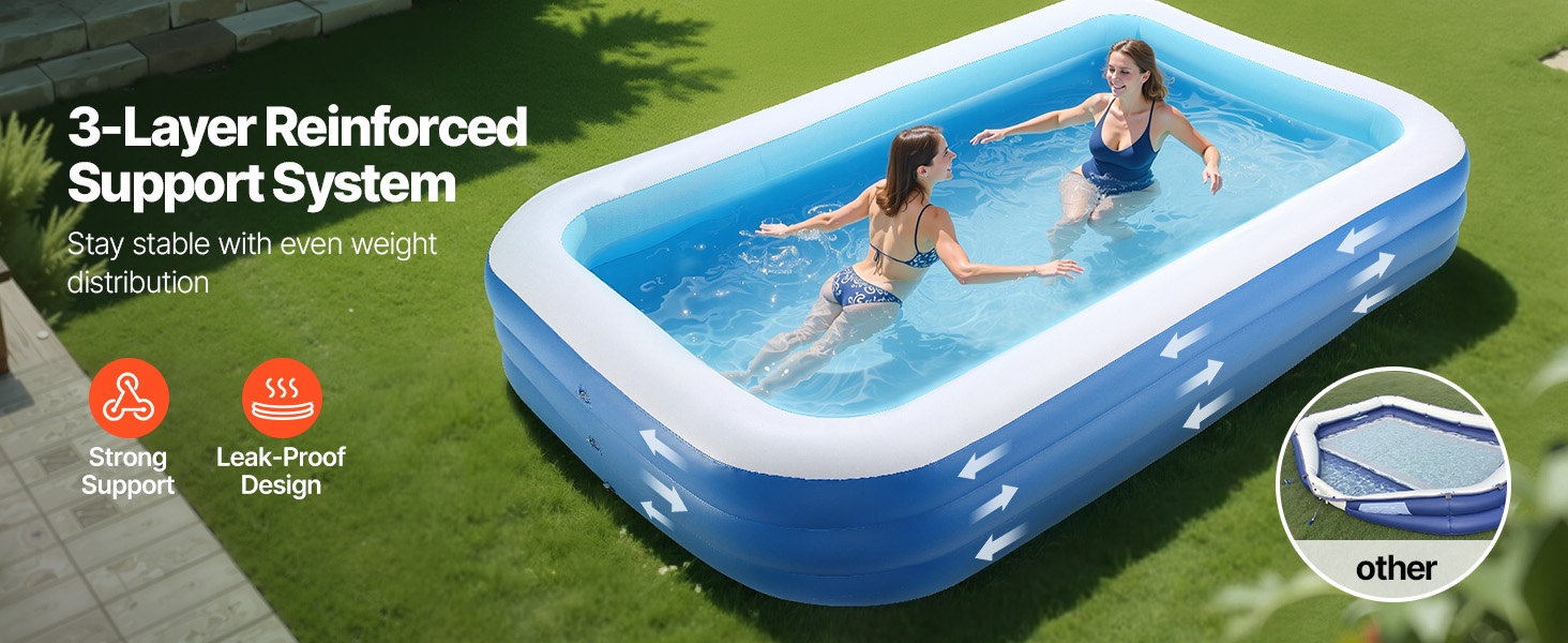 Nafukovací bazén VEVOR pre deti a dospelých je vybavený 3 nezávislými vzduchovými komorami, ktoré vytvárajú trojitú prstencovú nosnú konštrukciu. Rovnomerne rozkladá tlak, čím poskytuje zvýšenú stabilitu a znižuje kolísanie alebo nakláňanie. Užite si bezpečné a zábavou naplnené leto vo vode.