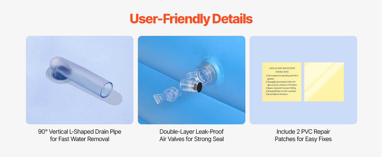Náš nafukovací bazén je vybavený vertikálnou vypúšťacou rúrkou v tvare písmena L s uhlom 90° na rýchle vypustenie vody, čo šetrí váš čas. Dvojvrstvové vzduchové ventily zlepšujú tesnosť, čím účinne znižujú riziko úniku vzduchu alebo vody. Užívajte si rýchly, jednoduchý a bezpečný zážitok z vody pri každom použití.