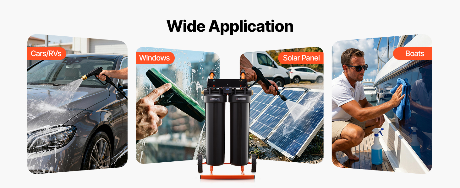 Tento systém deionizovanej vody bez škvŕn je vhodný na čistenie áut, karavanov, motocyklov, okien a solárnych panelov, pričom bez námahy dosahuje bezchybný výsledok bez zvyškov vodných škvŕn.