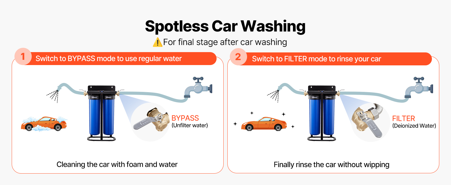 Prepnite do režimu BYPASS, aby ste umyli auto vodou z vodovodu, naniesli mydlovú penu a penu opláchli. Potom prepnite do režimu FILTER pre záverečné opláchnutie deionizovanou vodou a nechajte auto prirodzene uschnúť na vzduchu, aby ste dosiahli bezchybný výsledok.