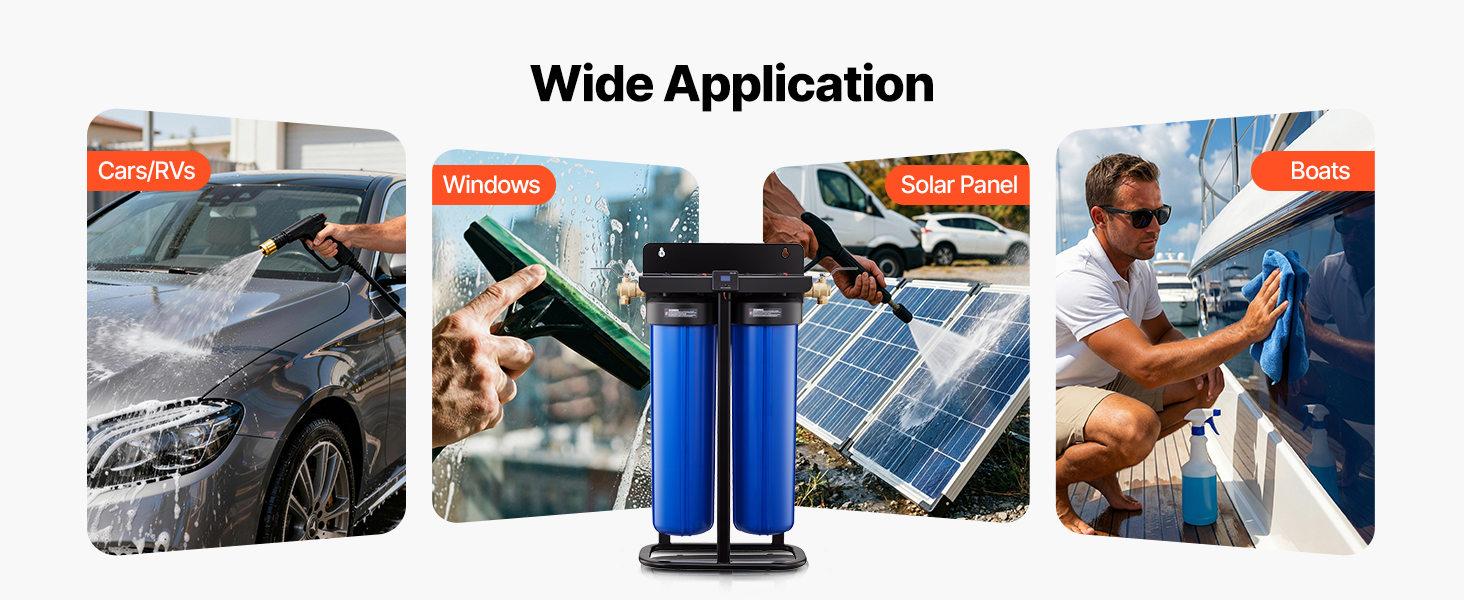 Tento systém deionizovanej vody bez škvŕn je vhodný na čistenie áut, karavanov, motocyklov, okien a solárnych panelov, pričom bez námahy dosahuje bezchybný výsledok bez zvyškov vodných škvŕn.