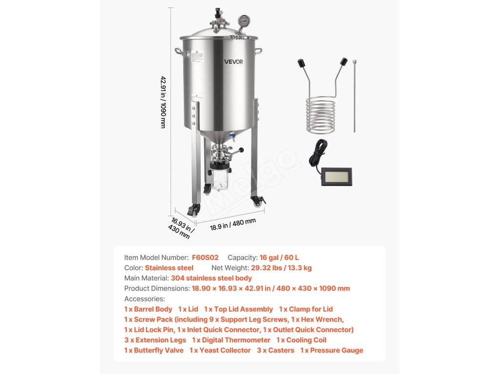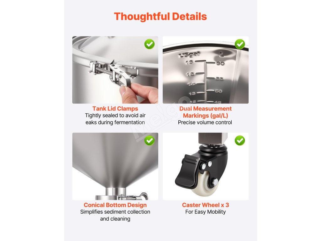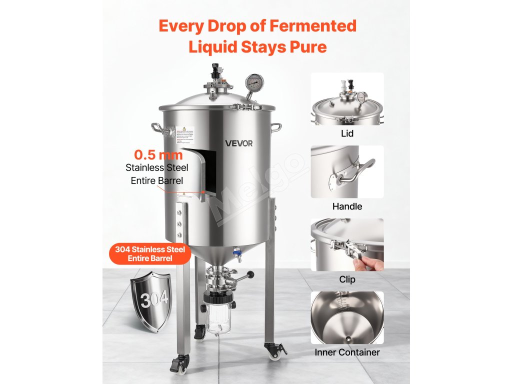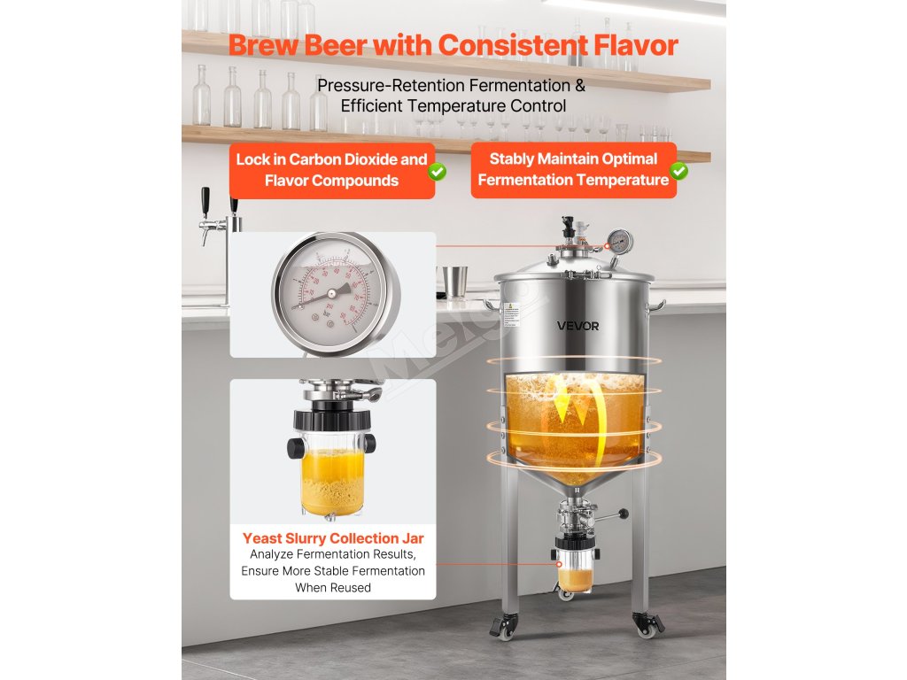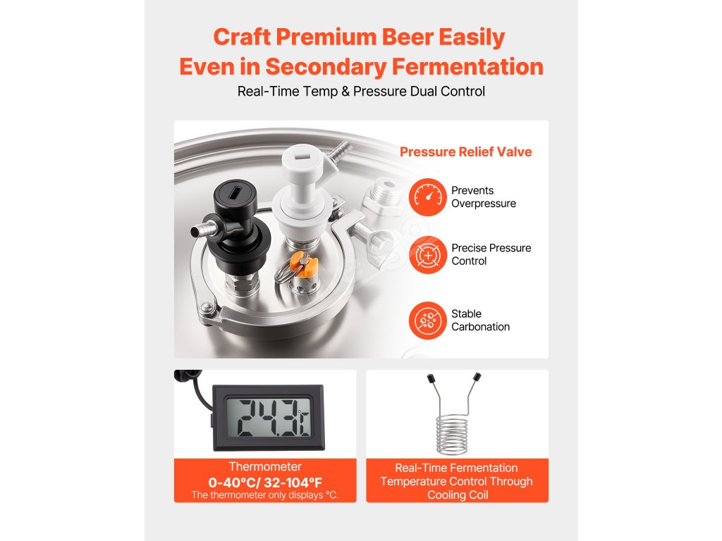 Tento fermentor kombinuje vysokokvalitnú nehrdzavejúcu oceľ 304, fermentačný systém udržiavajúci tlak, presnú reguláciu teploty a tlaku a užívateľsky prívetivý dizajn v jednej jednotke. Nadšenci domáceho varenia piva aj malosérioví pivovarníci môžu ľahko dosiahnuť sekundárnu fermentáciu na profesionálnej úrovni, čím sa zabezpečí konzistentná chuť a spoľahlivá kvalita každej várky piva.