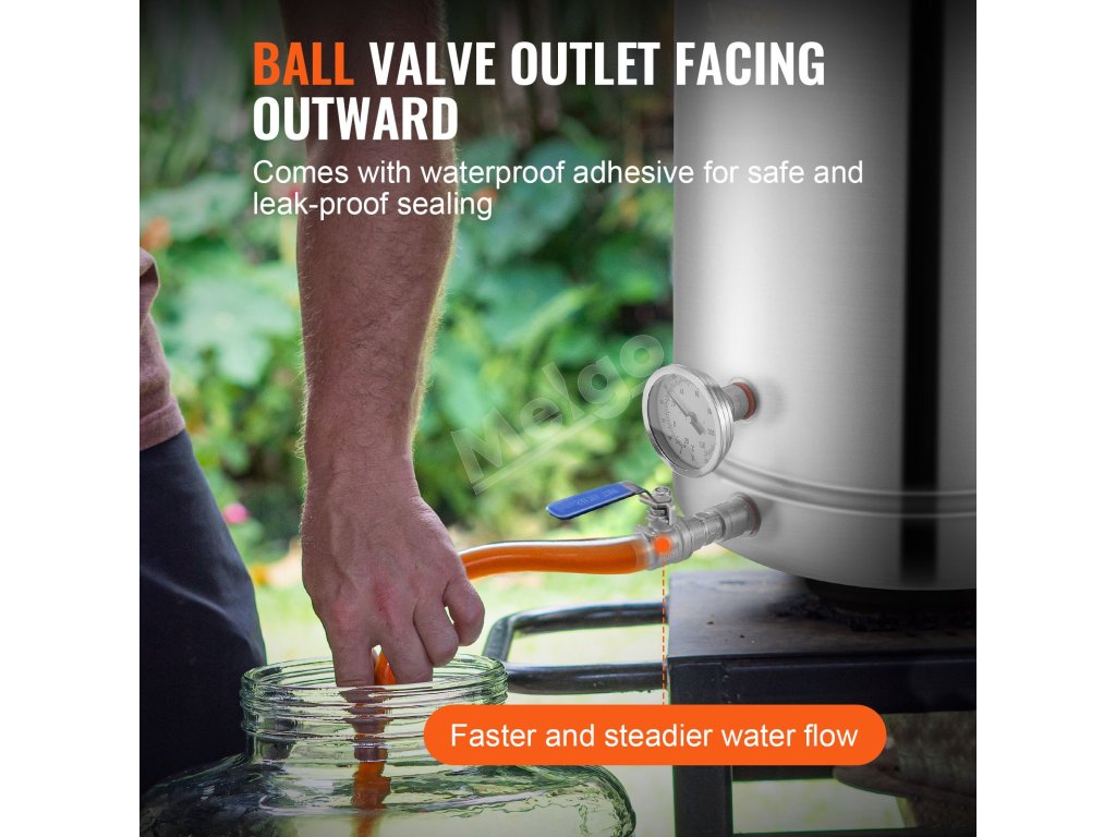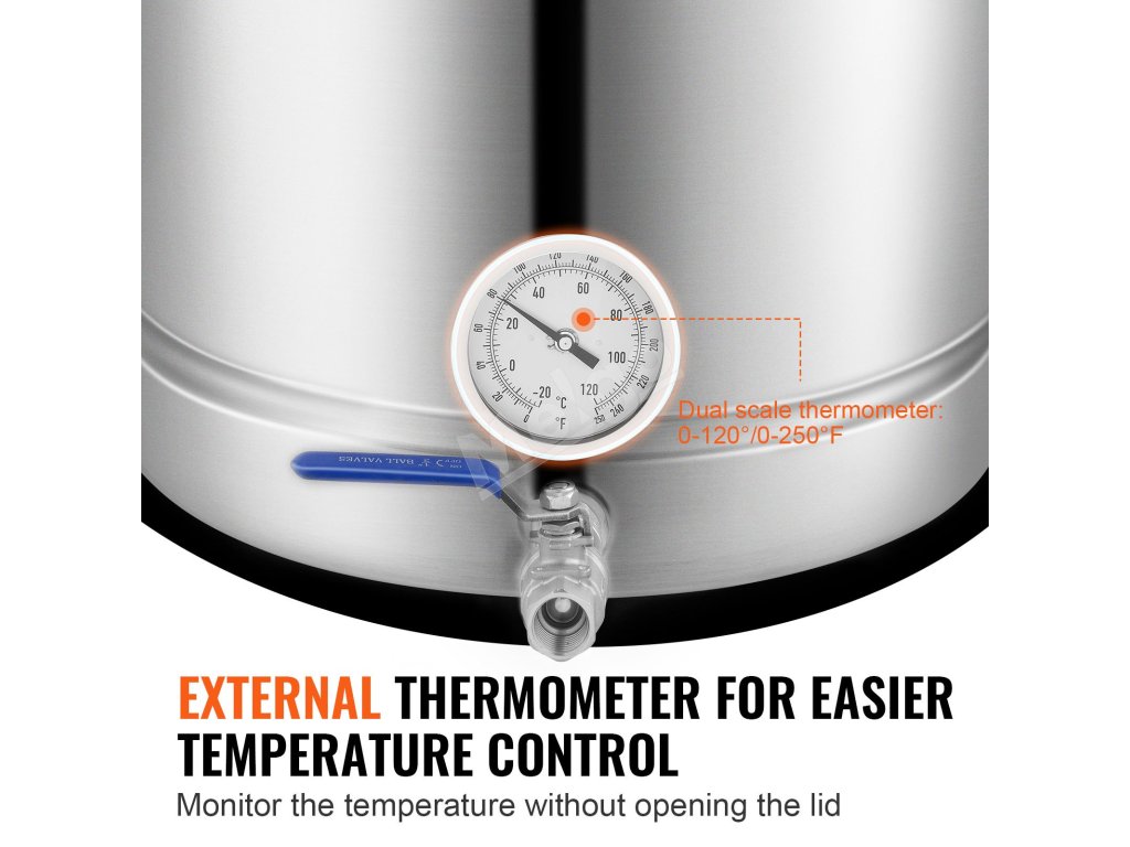 Vďaka vonkajšiemu teplomeru nie je potrebné dvíhať veko, čo zaručuje efektívny spôsob monitorovania teploty. Teplomer s dvojitým označením poskytuje rýchle údaje na presnú kontrolu teploty. Guľový ventil smerujúci von zaisťuje rýchlejší prietok bez striekajúcej vody.