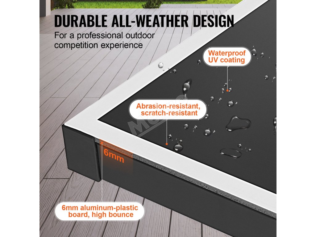 Tento pingpongový stôl je vyrobený z hliníkovo-plastovej dosky + UV farby. Poskytuje vynikajúcu hrateľnosť a výkon za každého počasia. Vďaka svojej odolnosti je stôl ideálnym doplnkom do každého vonkajšieho prostredia, ako je dvor, terasa, garáž alebo veranda na zábavu.