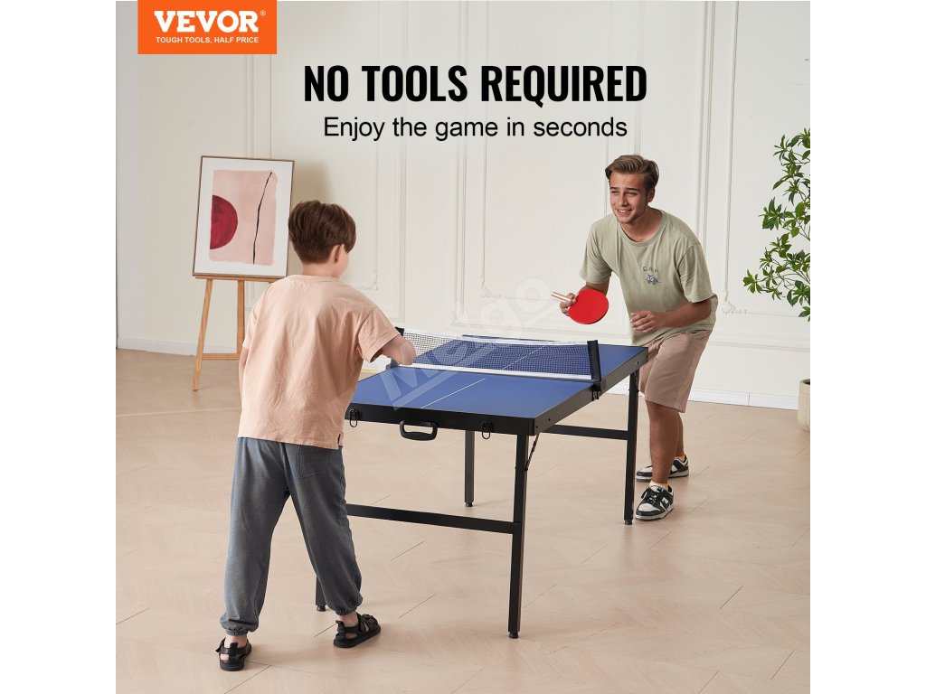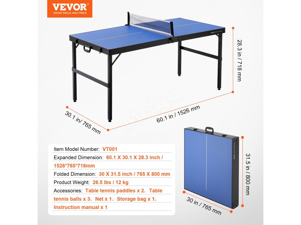 Veľkosť výrobku: 60x26x28 palcov. Tento stôl na stolný tenis spĺňa všetky vaše rekreačné potreby s deťmi. Rozmery v zloženom stave: 30x31,5 palca, možno ho umiestniť do akéhokoľvek rohu domu a uvoľniť tak priestor.