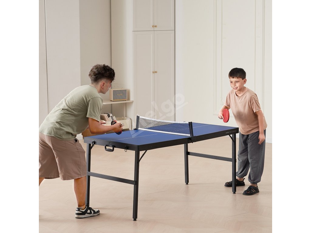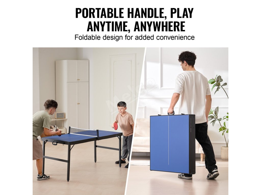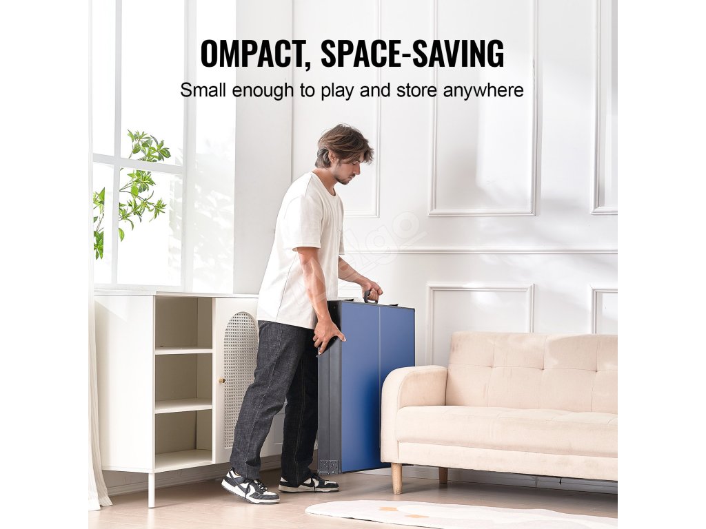 Tento interiérový prenosný pingpongový herný stôl možno v priebehu niekoľkých sekúnd zložiť na uskladnenie a pomocou zabudovanej rukoväte ho môže ľahko prenášať jedna osoba.