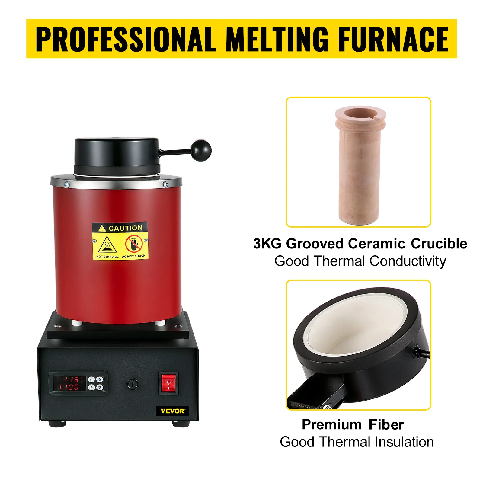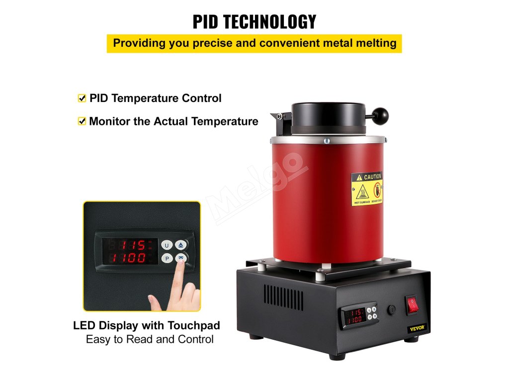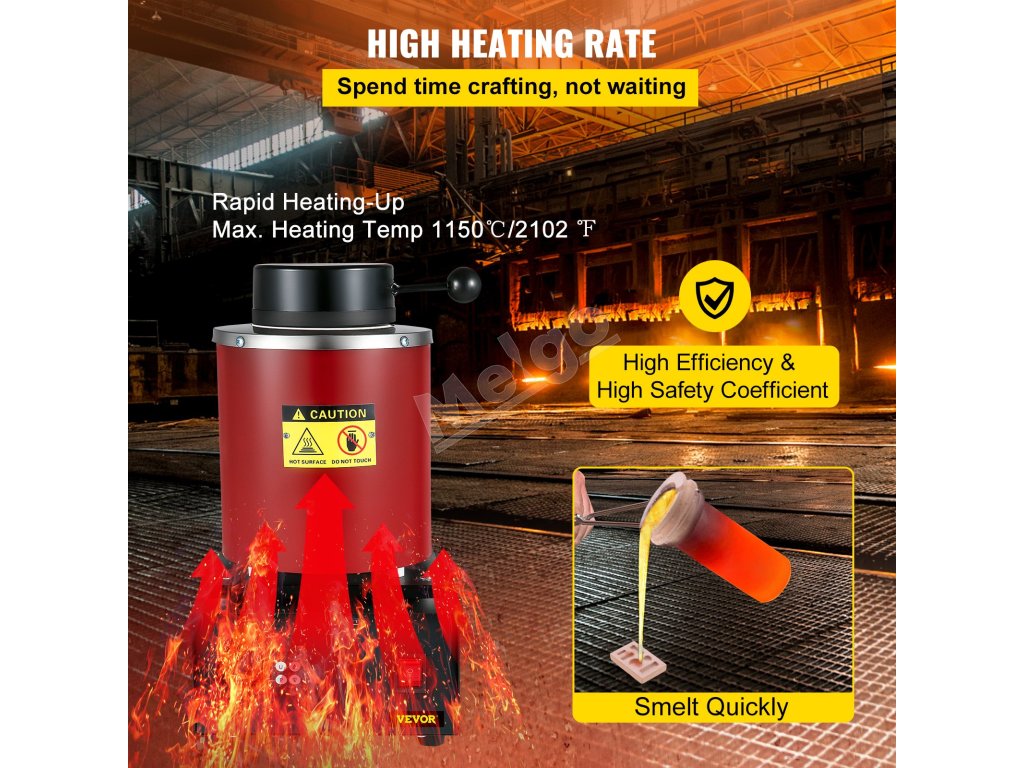 Pec na tavenie kovov využíva vysokoteplotný zliatinový ohrievací drôt na rýchle a efektívne zahrievanie, ktoré dosahuje až 2102 ℉ / 1150 ℃. Kovy s teplotou topenia nižšou ako 2012 ℉ / 1100 ℃ roztaví približne za 45 minút vrátane zlata, rýdzeho striebra, čistej medi a hliníka.