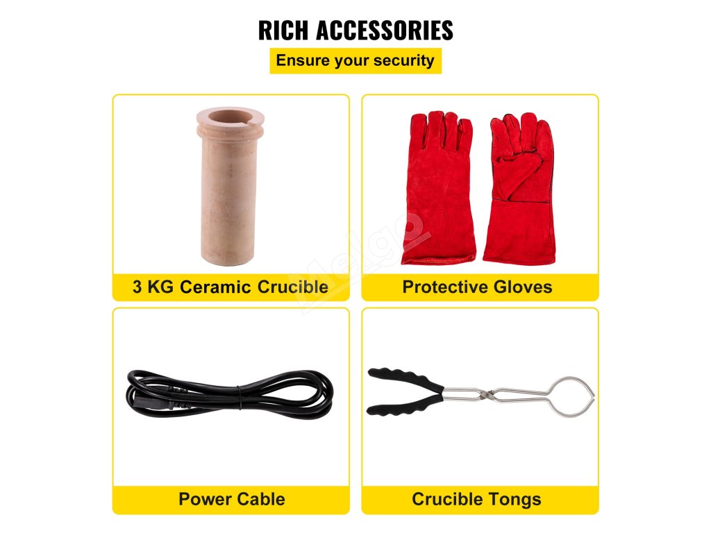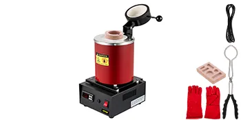 Táto súprava taviacej pece na zlato obsahuje 3 kg téglik, ingotovú matricu, kliešte na téglik, napájací kábel a ochranné rukavice. Poskytujeme všetko potrebné na zaistenie vašej bezpečnosti.