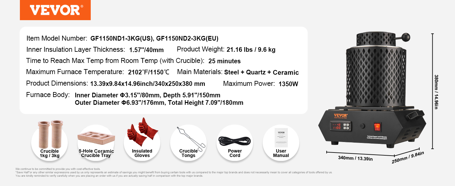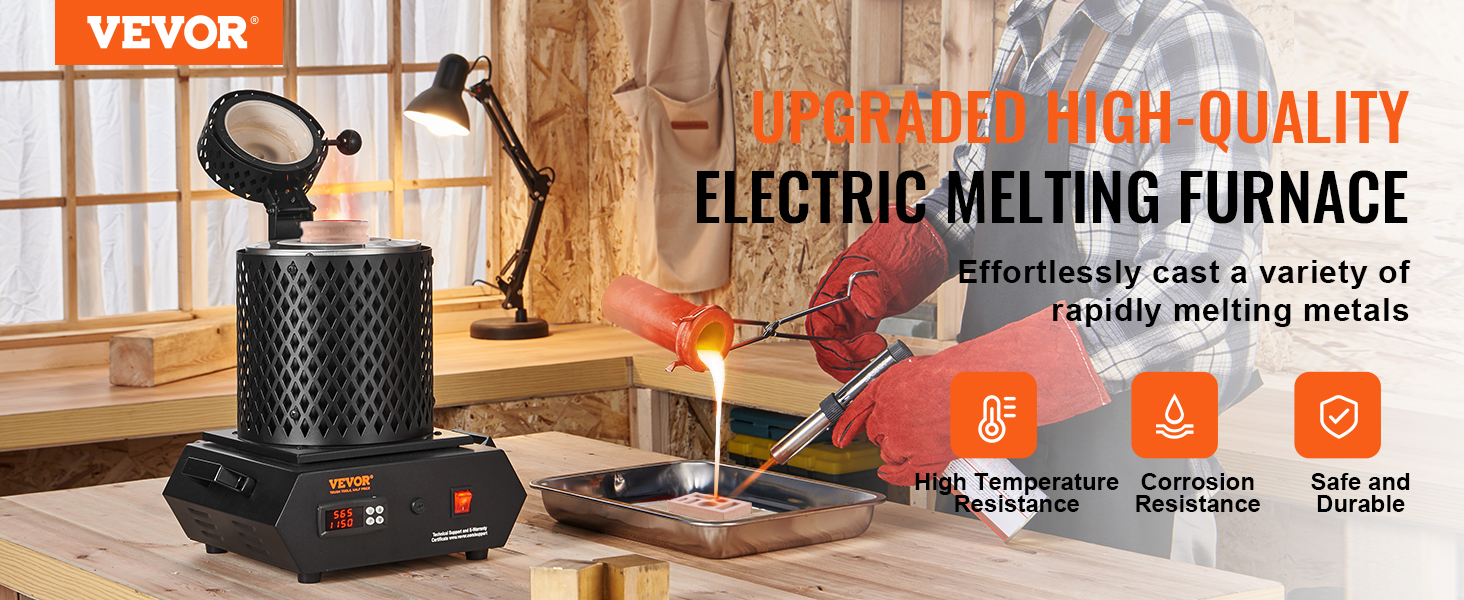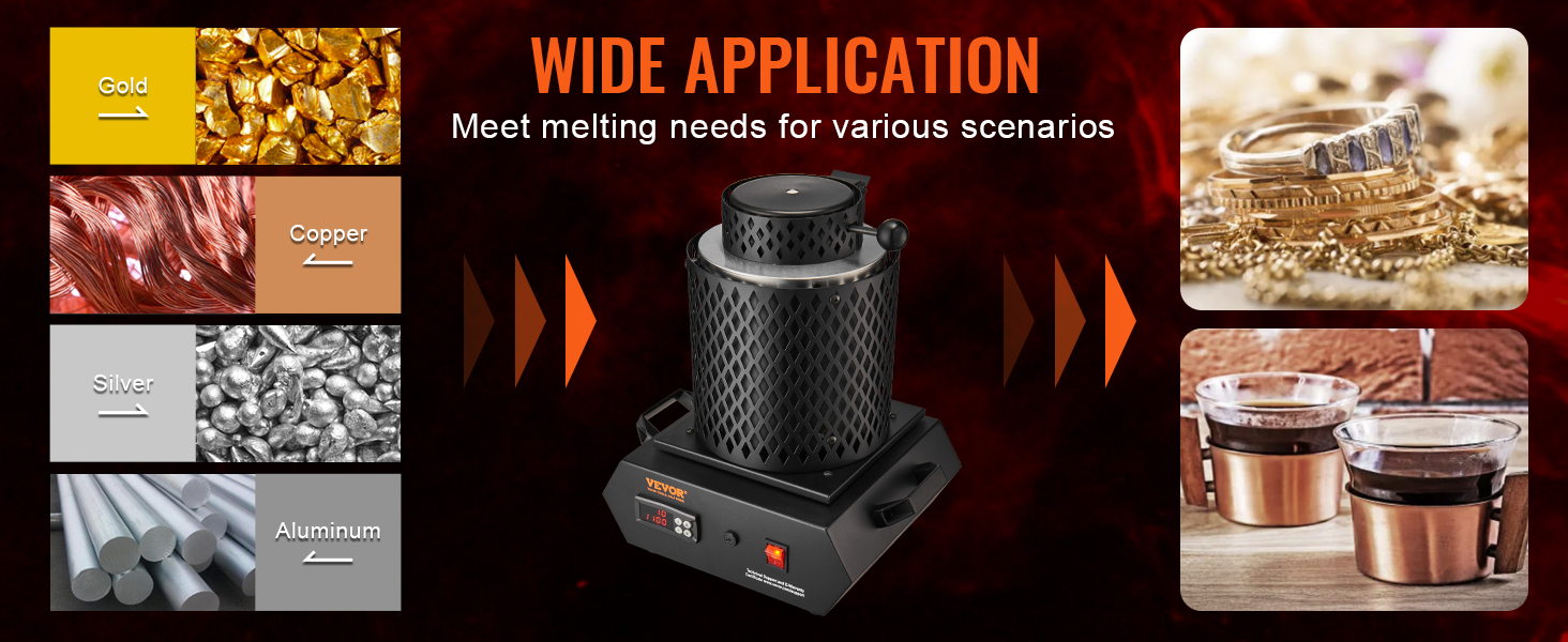 Naša taviaca pec je ideálna na výrobu zlatých prútov, tavenie drahých kovov a šperkov, recykláciu šrotu, zušľachťovanie šperkov a odlievanie rôznych kovov vrátane zlata, striebra, olova, medi, bronzu a hliníka. Poznámka: S taviacou pecou manipulujte opatrne, aby ste zabránili kontaktu s vysokými teplotami.