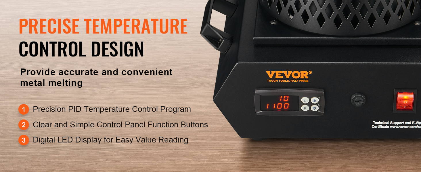 Táto elektrická taviaca pec, navrhnutá s digitálnym riadiacim systémom PID, monitoruje a upravuje teplotu v reálnom čase. Vďaka iba štyrom tlačidlám na ovládacom paneli a prehľadnému digitálnemu LED displeju poskytuje presnú reguláciu teploty aj pre začiatočníkov.