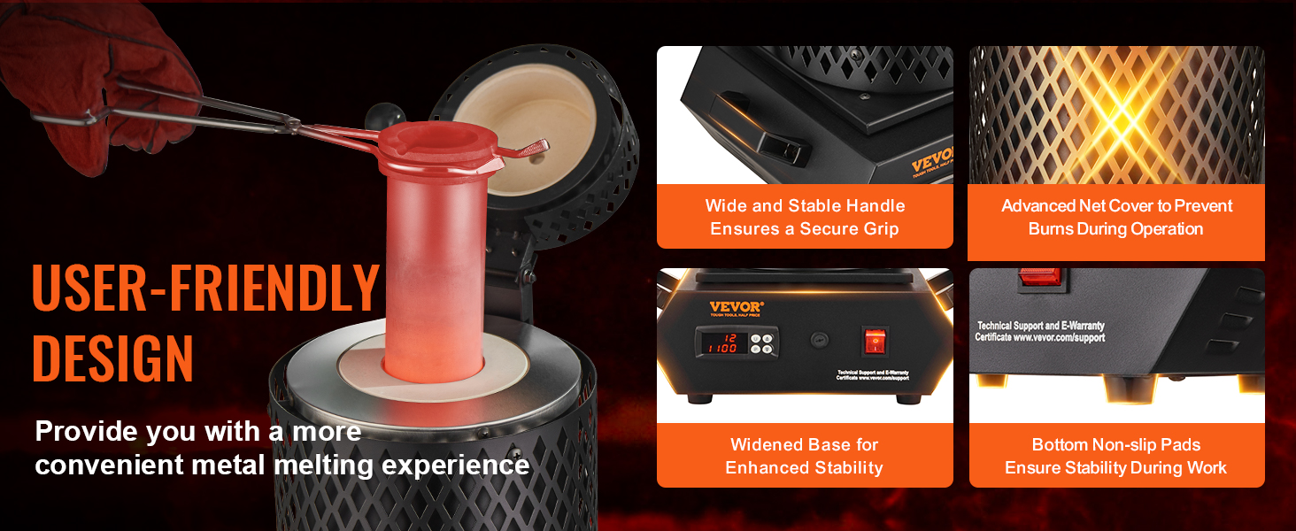 Táto súprava pece na tavenie kovov má niekoľko praktických konštrukčných prvkov: rozšírenú základňu na zvýšenie stability, zdokonalený sieťový čelný štít na zníženie kontaktu s teplom počas prevádzky, široké, stabilné rukoväte na bezpečné uchopenie a spodné protišmykové podložky, ktoré udržujú pec stabilnú počas používania.