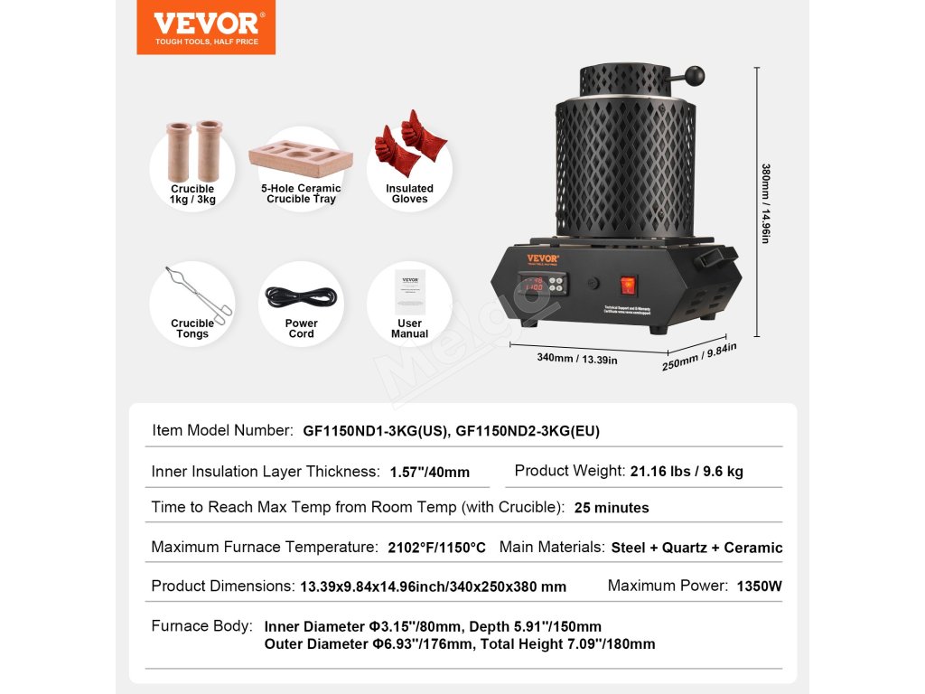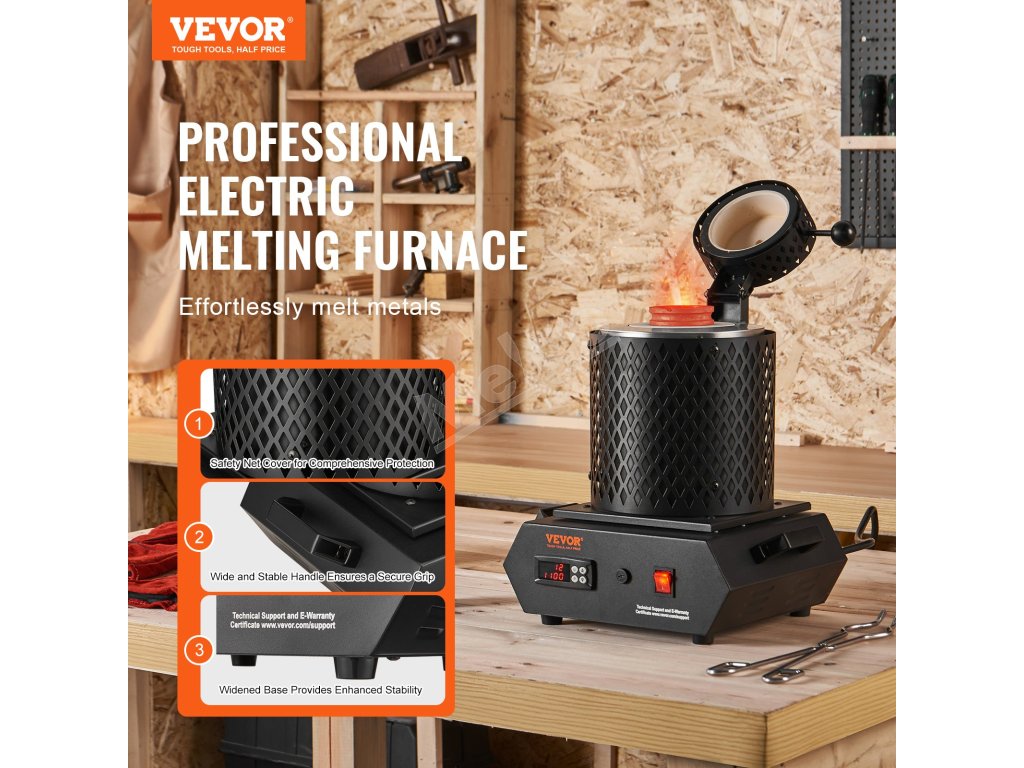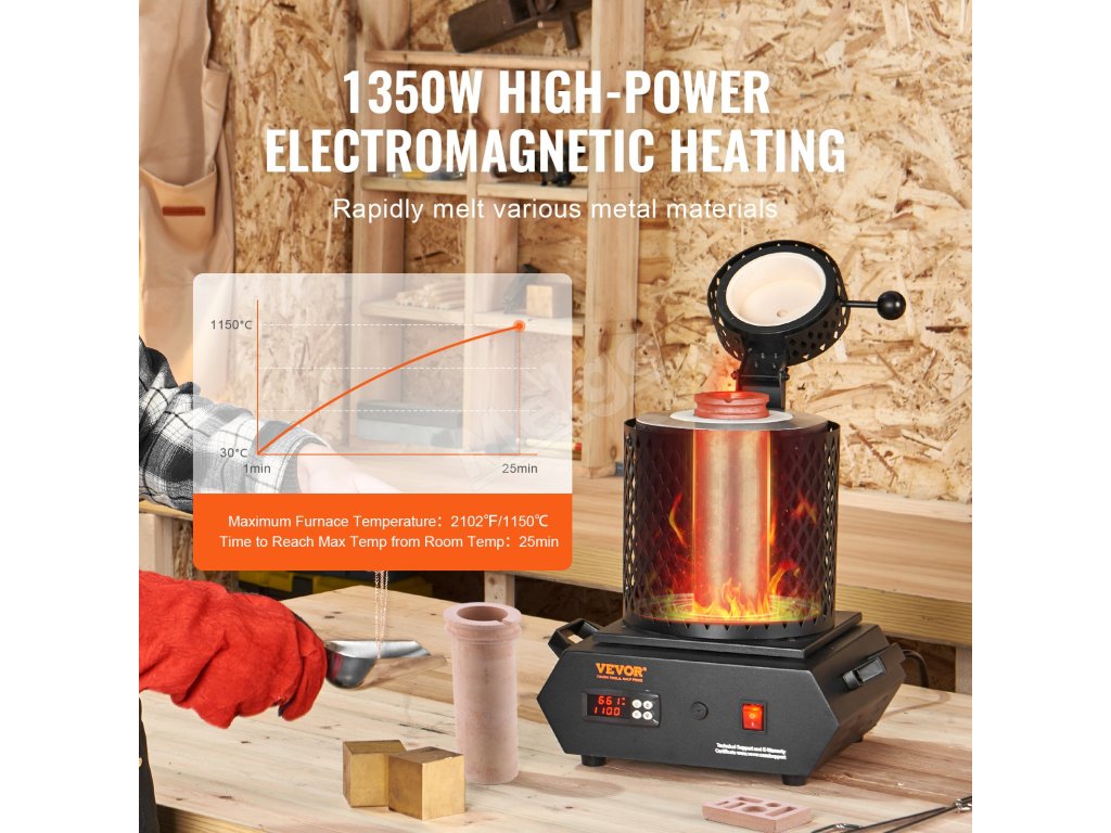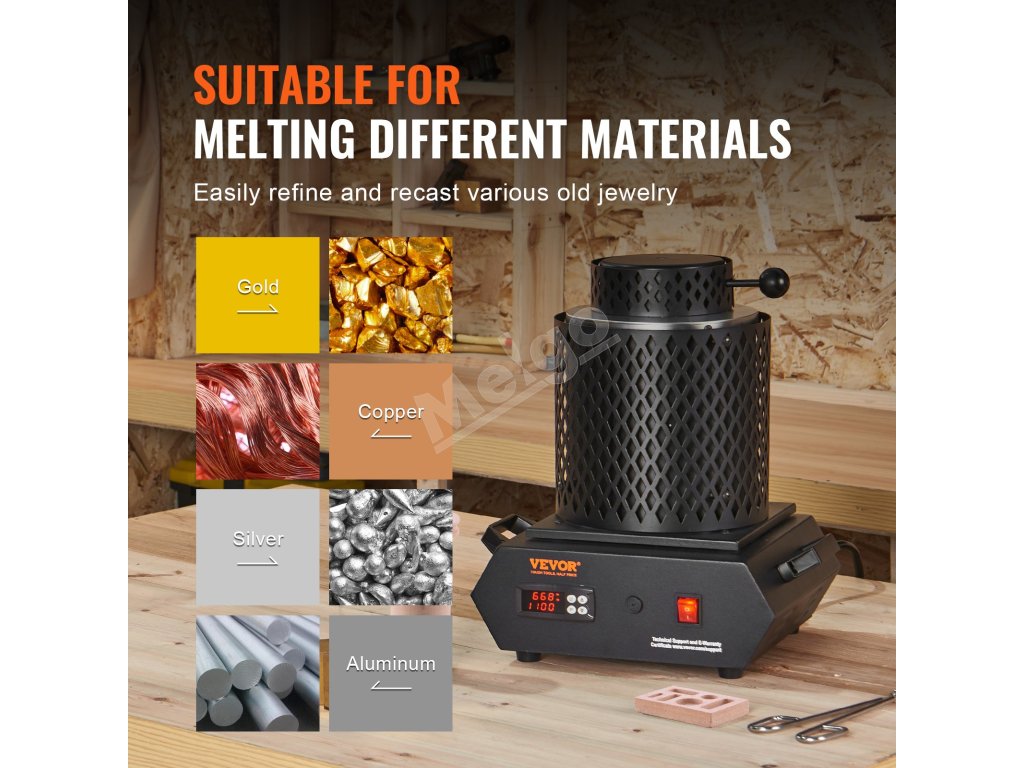 Naša taviaca pec je ideálna na výrobu zlatých prútov, tavenie drahých kovov a šperkov, recykláciu šrotu, zušľachťovanie šperkov a odlievanie rôznych kovov vrátane zlata, striebra, olova, medi, bronzu a hliníka. Poznámka: S taviacou pecou manipulujte opatrne, aby ste zabránili kontaktu s vysokými teplotami.