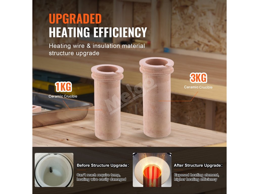 Naša vysoko výkonná elektrická pec s výkonom 1350 W dokáže dosiahnuť teplotu až 2100 °C, pričom prechod z izbovej teploty na maximálnu trvá len 25 minút. Vďaka optimalizovaným vykurovacím telesám a izolácii taví kovy s bodom tavenia nižším ako 2100°F len za 40-55 minút.