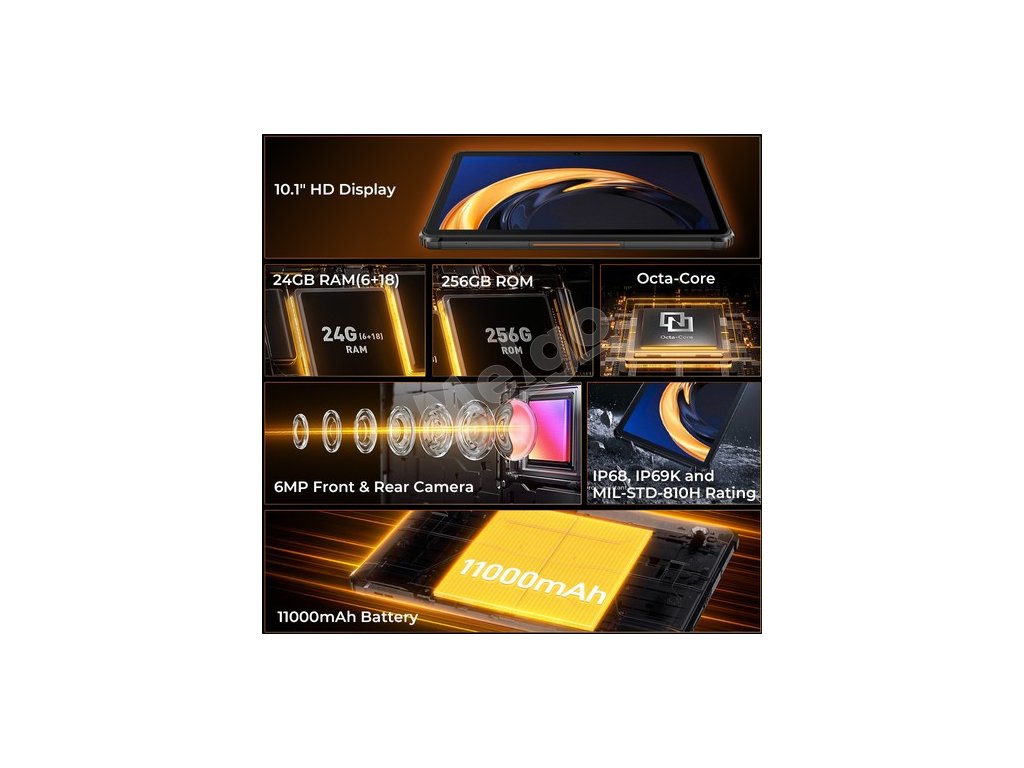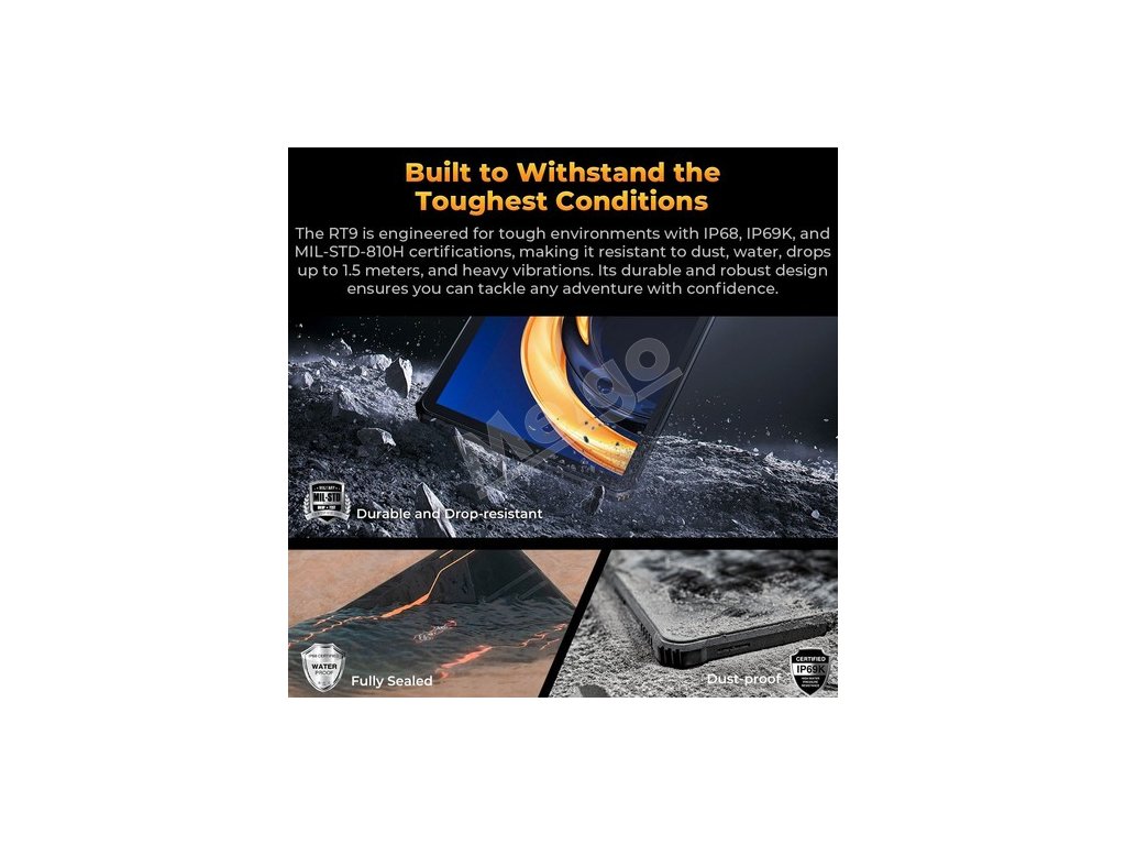 Odolný tablet OUKITEL RT9 je navrhnutý na vonkajšie použitie a vyznačuje sa stupňom krytia IP68 (odolnosť voči vode z výšky 1,5 metra), IP69K (odolnosť voči pádu) a odolnosťou voči prachu z výšky 30 metrov. Jeho obrazovka Corning Gorilla Glass je odolná voči poškriabaniu a poškodeniu a spĺňa požiadavky vojenského štandardu MIL-SD-810H, takže je ideálnou voľbou pre poľnohospodárov, baníkov alebo prieskumníkov.